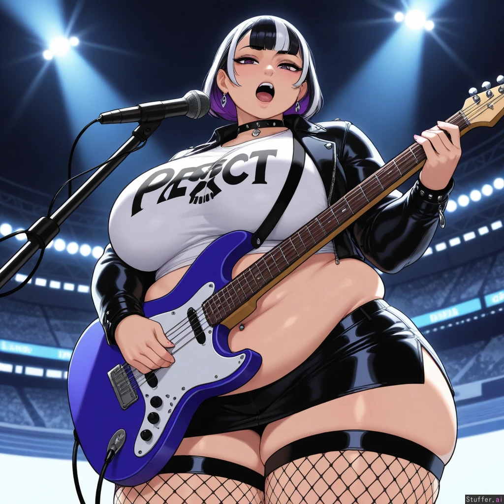 (Krekkov (artist), KAMII MOMORU(artist), KipTeiTei(artist), Lewdlemage(artist)), beautiful shading, highly detailed, best quality, perfect anatomy, perfect proportions, perfect lighting, (best quality), (high rating), absurd res, high res, detailed, ultra quality, ((high quality)), masterpiece, (ultra high resolution), anime style, stunning beauty, detailed face, intricate detail, sophisticated detail, 1girl, exquisite detail, absurd resolution, correct anatomy, 8k, (highly detailed face), highly detailed skin texture, goth_girl, short_black_pixiecut_with_pink_highlights, purple_eyes, silver_earrings, choker, black_leather_jacket, white_skull_t-shirt, midriff, navel_piercing, black_leather_miniskirt, fishnet_stockings, singing, playing_guitar, stadium, (obese:1.35)