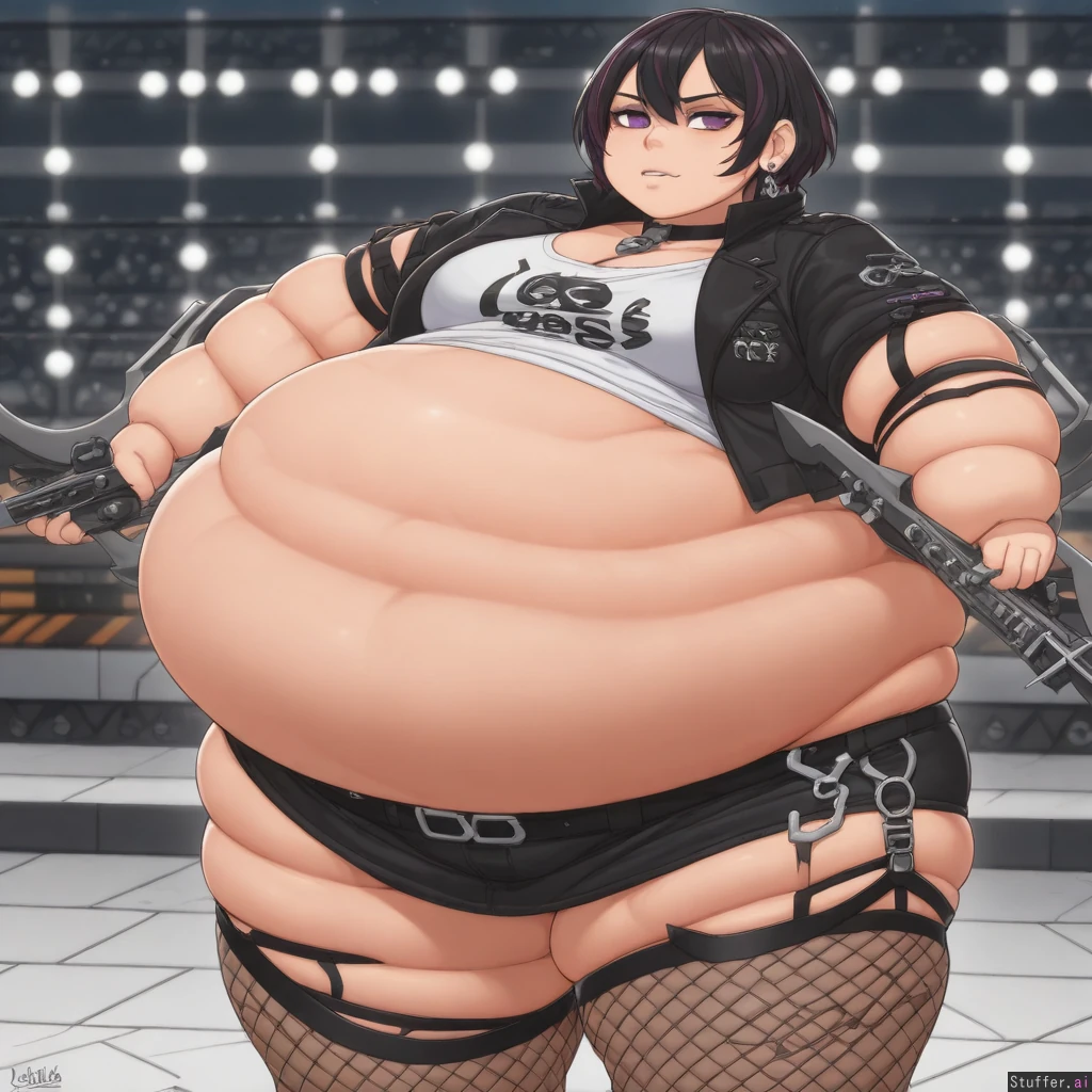 (Krekkov (artist), KAMII MOMORU(artist), KipTeiTei(artist), Lewdlemage(artist)), beautiful shading, highly detailed, best quality, perfect anatomy, perfect proportions, perfect lighting, (best quality), (high rating), absurd res, high res, detailed, ultra quality, ((high quality)), masterpiece, (ultra high resolution), anime style, stunning beauty, detailed face, intricate detail, sophisticated detail, 1girl, exquisite detail, absurd resolution, correct anatomy, 8k, (highly detailed face), highly detailed skin texture, goth_girl, short_black_pixiecut_with_pink_highlights, purple_eyes, silver_earrings, choker, black_leather_jacket, white_skull_t-shirt, midriff, navel_piercing, black_leather_miniskirt, fishnet_stockings, singing, playing_guitar, stadium, (obese:3.0)