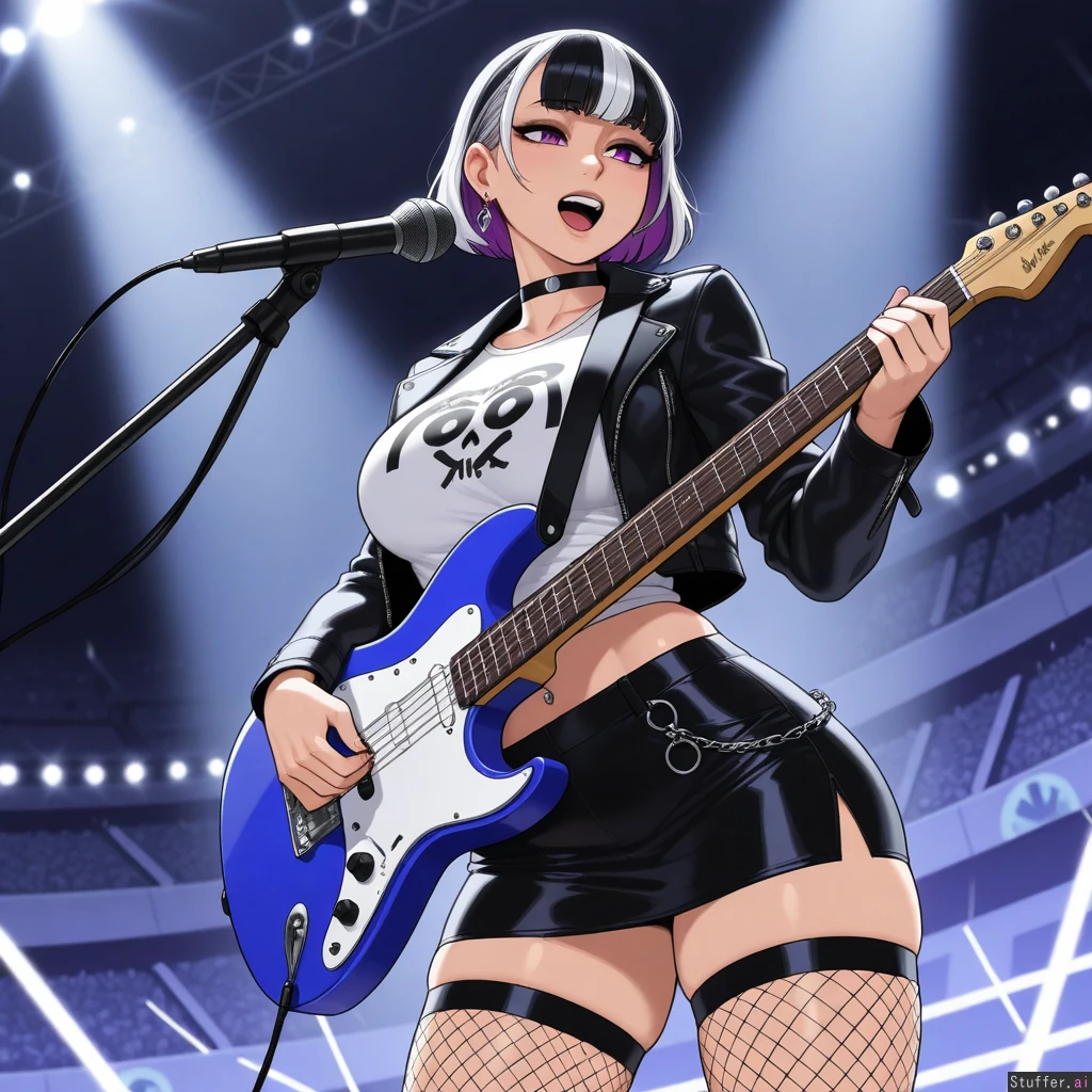 (Krekkov (artist), KAMII MOMORU(artist), KipTeiTei(artist), Lewdlemage(artist)), beautiful shading, highly detailed, best quality, perfect anatomy, perfect proportions, perfect lighting, (best quality), (high rating), absurd res, high res, detailed, ultra quality, ((high quality)), masterpiece, (ultra high resolution), anime style, stunning beauty, detailed face, intricate detail, sophisticated detail, 1girl, exquisite detail, absurd resolution, correct anatomy, 8k, (highly detailed face), highly detailed skin texture, goth_girl, short_black_pixiecut_with_pink_highlights, purple_eyes, silver_earrings, choker, black_leather_jacket, white_skull_t-shirt, midriff, navel_piercing, black_leather_miniskirt, fishnet_stockings, singing, playing_guitar, stadium