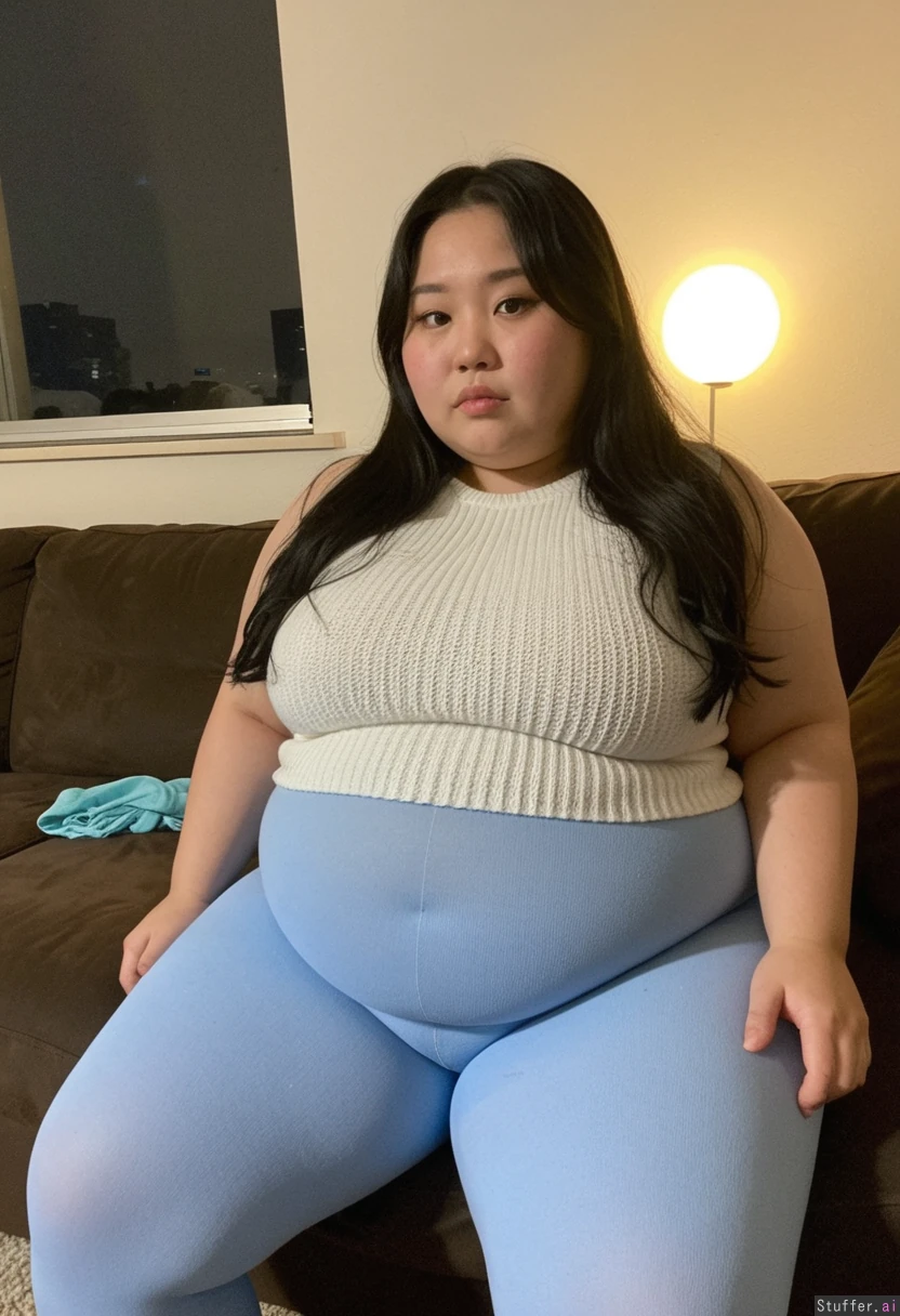 morbidly_obese_blob, (((korean woman))), big_belly, long black hair, no makeup, (((wearing light blue tights and white (sleeveless) knitted top))), sitting in living room, night, puffy_face, bloated