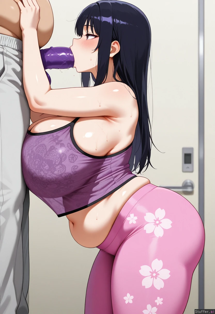 Solo Female , (standing straight) , (Black Hair) , (tight see through Purple Lace Tank top) , (Pink floral Yoga Pants) , (huge Breasts) , (self deepthroat dildo into her mouth) , (side view) , fat belly, back rolls, belly hang, fatter, belly as big as breasts. Bigger softer belly