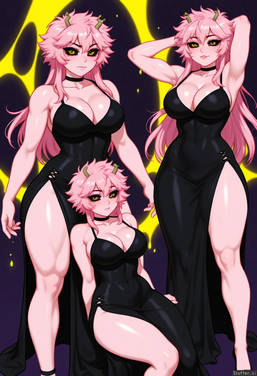 (( blushyspicy)) (( ashido_mina, black_sclera, yellow_eyes, very_long_hair, pink_hair, muscular_female, thick_legs, thick_arms)) (( gigantic_breasts:0.9)) (( Long_dress, black_dress, choker, cleavage))