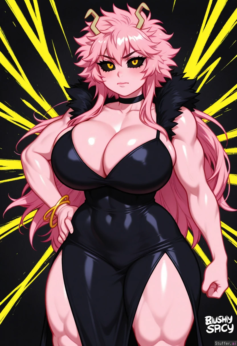 (( blushyspicy)) (( ashido_mina, black_sclera, yellow_eyes, very_long_hair, pink_hair, muscular_female, thick_legs, thick_arms)) (( gigantic_breasts:1.1)) (( Long_dress, black_dress, choker, cleavage))