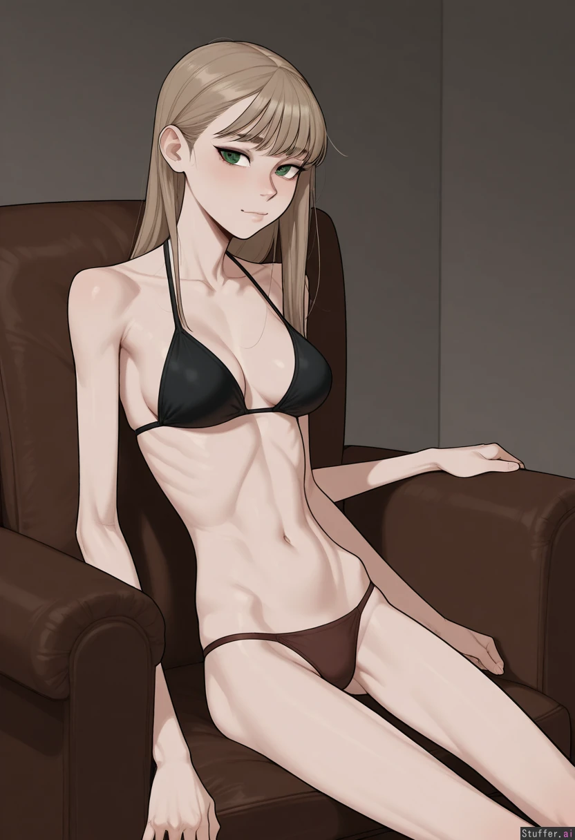 Solo, Krekkov (artist), KAMII MOMORU(artist), (Flat colors), perfect proportions, skindentation, hdr, (Long straight light brown hair with bangs), dark green eyes, flirty, (((black bikini top, brown panties))), sexy pose, pouting living room, sitting on a chair, (slight side view) (Medium breasts), (skinny body:1.9), breasts expanding, gaining weight, (satisfied face), (extremely fat overweight body:1.0), (chubby:0.70), (plump over hanging belly:1.0)