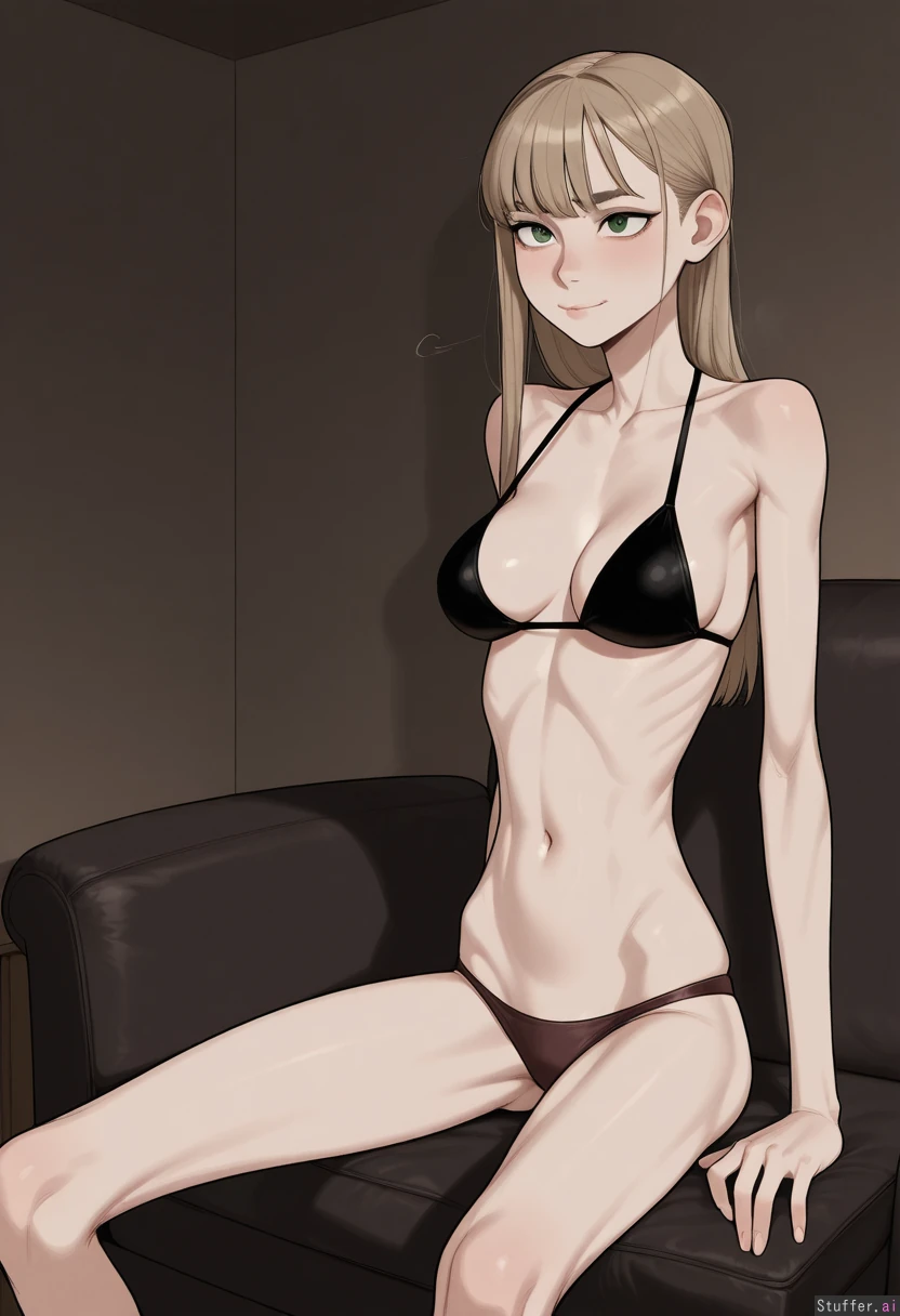 Solo, Krekkov (artist), KAMII MOMORU(artist), (Flat colors), perfect proportions, skindentation, hdr, (Long straight light brown hair with bangs), dark green eyes, flirty, (((black bikini top, brown panties))), sexy pose, pouting living room, sitting on a chair, (slight side view) (Medium breasts), (skinny body:1.9), breasts expanding, gaining weight, (satisfied face), (extremely fat overweight body:1.0), (chubby:0.70), (plump over hanging belly:1.0)