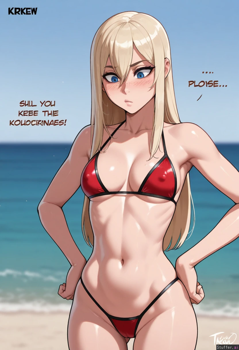 (nyantcha:1.2), (krekkov:1.3), (reiq:1.1), (kittew:1.2), 8k, high resolution, maximum pixel density, masterpiece, (((highly detailed))), ((flawless)), (((high rating))), ((highly detailed face)), full resolution, 8k, high resolution, best quality, detailed eyes, ((solo)) Appearance: Long straight blonde hair, blue eyes, tan skin, freckles, blushing heavily, anime-woman, shocked expression, pouting, tall, erect nipples, wide hips, Outfit: red bikini top, black thong Location: posing at beach, semi side-view, looking down at self, hands on hips Modifiers: (Slim body:1.9), (large breasts:0.85), (extremely overweight ssbbw:1.0), (chubby:1.0), (large overhanging fat belly:1.0), (fat butt:1.0)