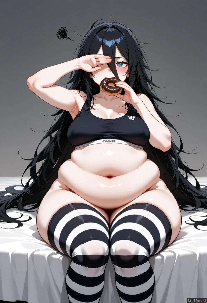 annoyed, messy hair, very long hair, black hair, long bangs covering eyes, pale skin, blue eyes, big fat belly, tiny black sports bra, extremely bottom heavy, tiny black and white striped stockings, nude, front view, facing forwards, extremely wide hips, eating a chocolate donut, sitting on bed, large lower belly, massive belly, blushing, morbidly fat blob, cellulite