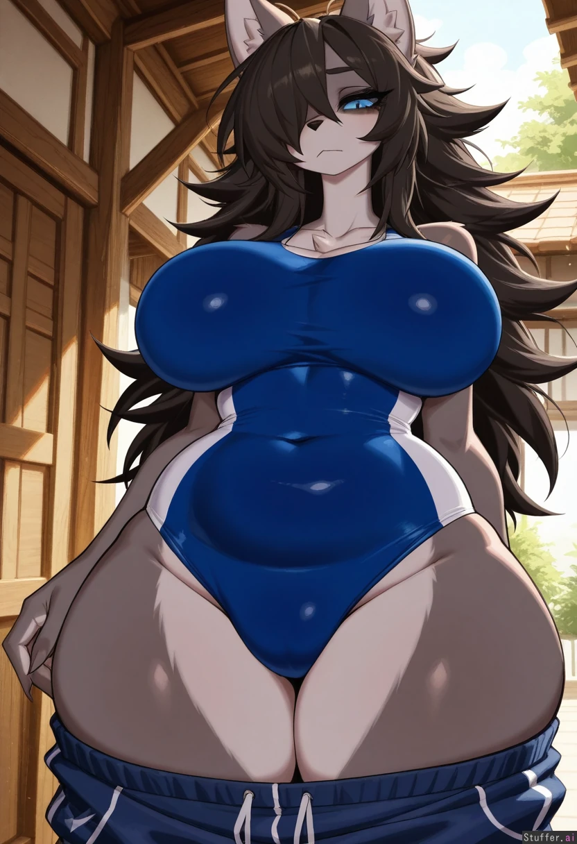 anthro wolf girl, dark gray fur, white belly, blue eyes, long black hair, long messy hair, hair covering one eye, furry, snout, furry, long snout, half closed eyes, seductive look, (taut swimsuit), Outside, backyard, ((standing)), midday, sunny,((taut blue one-piece swimsuit)), fat breasts, round breasts, low navel, white sclera, cute, tall, plump breasts, (big breasts: 1.4), vanripper style, usa37107692, ((massive crotch buldge: 1.7)), big buldge in pants