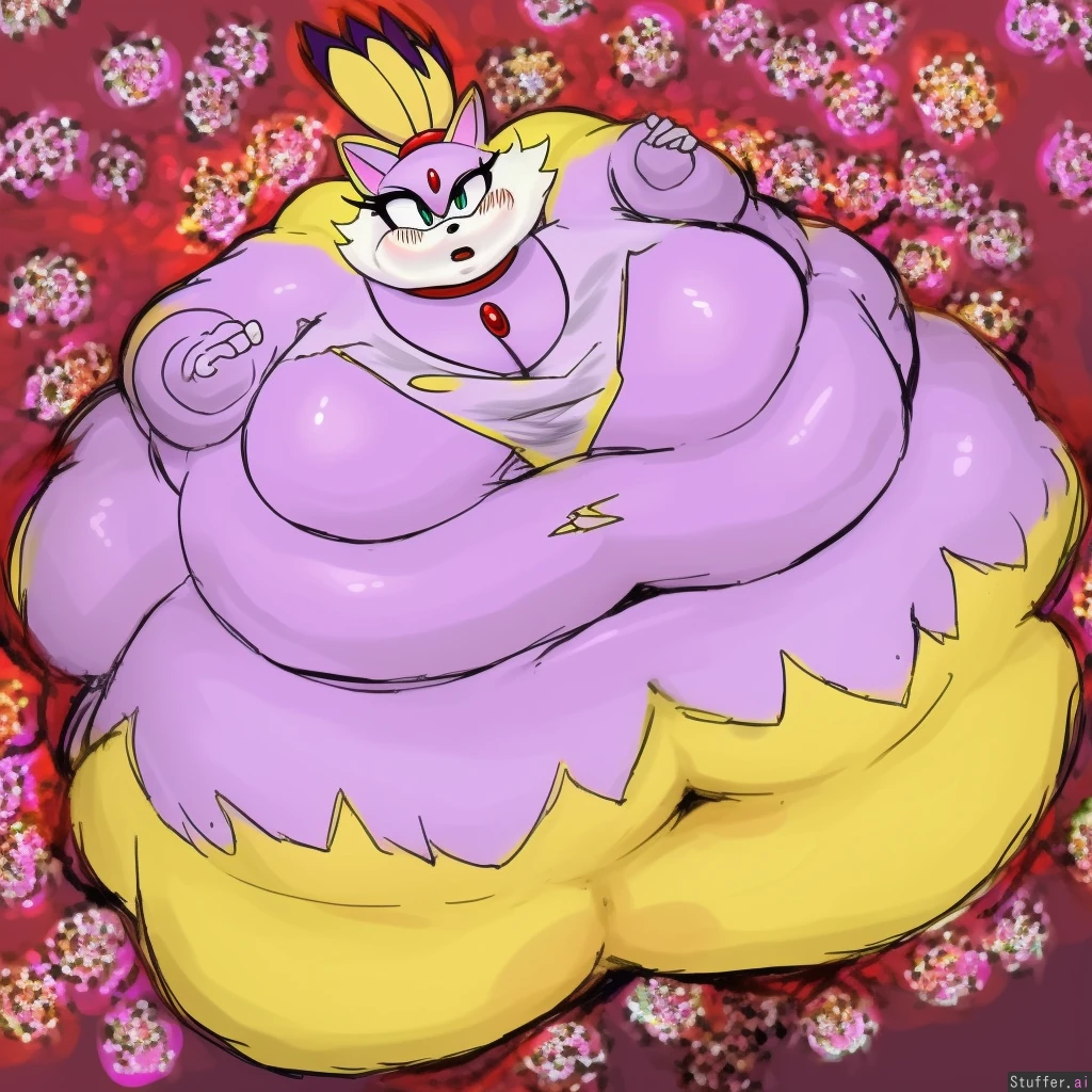best quality, high rating, solo, stunning beauty, (high rating), masterpiece, high quality, 8k, high resolution, intricate detail, sophisticated detail, beautiful face, detailed eyes, white skin c.cu(artist), blushyspicy(artist),((BWS(artist))) Blue eyes, pink bunny hairclip, beautiful face, pale skin, obese slut, (((blaze the cat, ))), blush, worried expression, concerned look, cheekbones, defined jawline, wide eyes, long eyelashes, nude, (((torn clothes, loose fitting, barely hanging on))), ((USsbbw)), (((very immobile ))), (circle-shaped body)), (extremely tall), fat face, multiple chins, (gigantic_belly),large belly, ((wide_hips)),(gigantic_hips), ((gigantic_fat body),((gigantic_thighs), (thick_belly), fat upper arms,(thick_calves), immobile, blob, blobby, too fat to move, Fat rolls, belly folds, belly rolls, wearing business suit on body. fatter 9 times fatter 9999999 times hybrid body ((Has a fat face))) (((has a fox tail))) (((in hyper form))) (((has yellow fur))) (((has a fat upper body))) city_background. uses tails to fly 9 times weighs 9999999lbs ((((chubby body fatter 9 times)))) regular thighs blueberryinflation details fatter 99999999999999 times ((((bottom half with yellow fur on body)))) ((((sliver the hedgehog trying to help in the background)))) (((very obese))) (((butt grows 5 times))) ((((has blaze the cats height 5 times)))) sega_artwork