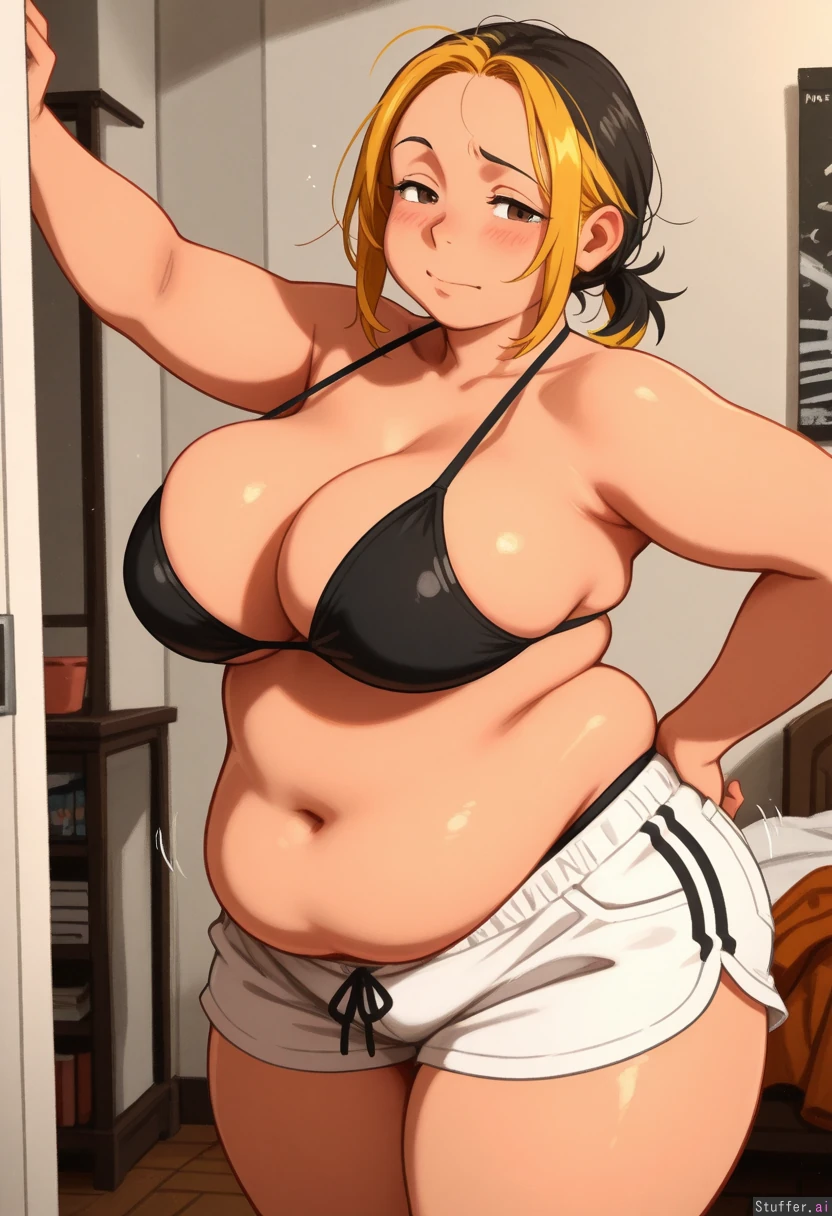 khyle. /(artist/), mature_female, undersized_clothes,(horny),embarassed, (obese_female), bedroom,motion lines,(detailed obese body:0.5),(fat face),(love handles),hyper thighs,bursting breasts,1woman,(black and blonde hair),(dyed black and blonde color),((black dyed hair)),(mostly black color on hair),dark brown eyes,((black hair)),(small ponytail),(black bikini),((white shorts)),(tired),
