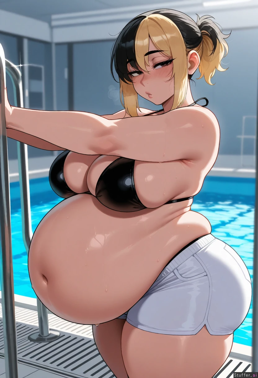solo, masterpiece, amazing resolution, nyantcha(artist), krekkov(artist), dramatic lighting, standing up, skindentation,(small ponytail), tall,(black bikini),((white shorts)), large breasts, looking at viewer, half closed eyes, tired, blushing, deep navel, wide hips, big ass, (obese, big belly, weight gain fetish),1woman,(black and blonde hair),(dyed black and blonde color),((black dyed hair)),(mostly black color on hair),dark brown eyes,((black hair)),(short ponytail),pool on background,