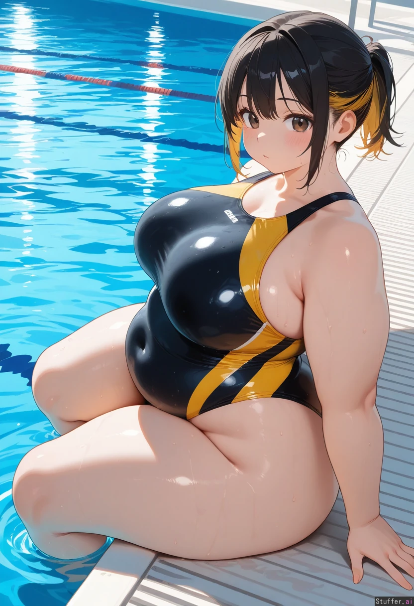 (uhd,best_quality,soft light,solo,1girl,no2people) sweaty person,looking_at_viewer swim pool, 1woman,(black and blonde hair),(dyed black and blonde color),((black dyed hair)),(mostly black color on hair),dark brown eyes,((black hair)),(short ponytail),pool on background, (gigantic brast:1.0),sit on the desk,(detailed obese body:1.0),(hyper thighs:1.0),((fat arms)),