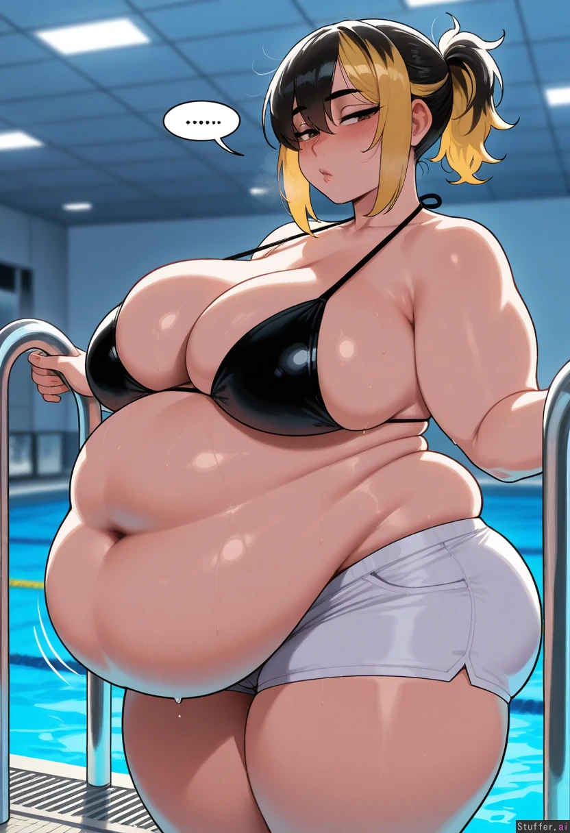 solo, masterpiece, amazing resolution, nyantcha(artist), krekkov(artist), dramatic lighting, standing up, skindentation,(small ponytail), tall,(black bikini),((white shorts)), large breasts, looking at viewer, half closed eyes, tired, blushing,(detailed obese body:1.4), deep navel, wide hips, big ass, (obese, big belly, weight gain fetish),1woman,(black and blonde hair),(dyed black and blonde color),((black dyed hair)),(mostly black color on hair),dark brown eyes,((black hair)),(short ponytail),pool on background,