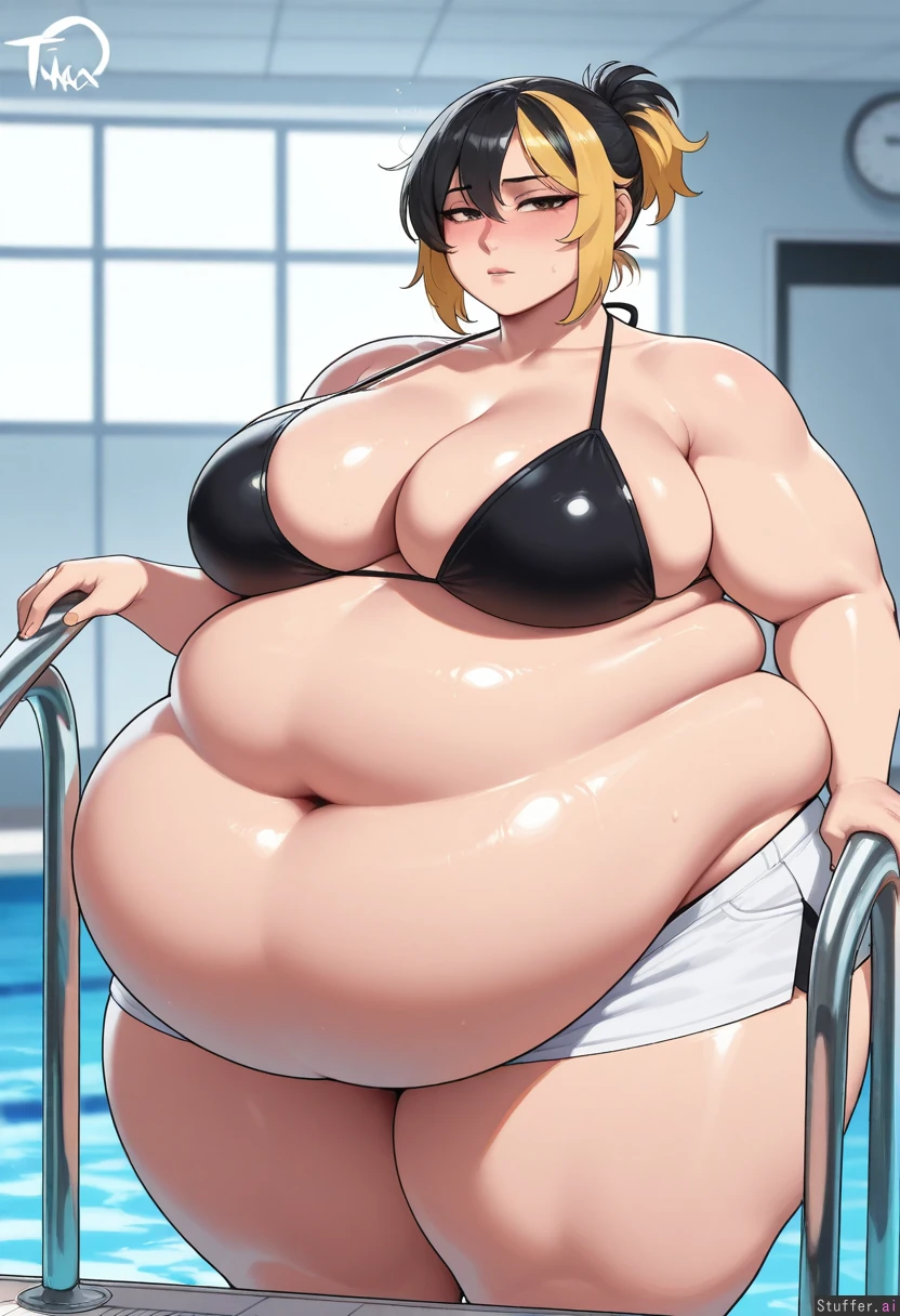 solo, masterpiece, amazing resolution, nyantcha(artist), krekkov(artist), dramatic lighting, standing up, skindentation,(small ponytail), tall,(black bikini),((white shorts)), large breasts, looking at viewer, half closed eyes, tired, blushing,(detailed obese body:2.0), deep navel, wide hips, big ass, (obese, big belly, weight gain fetish),1woman,(black and blonde hair),(dyed black and blonde color),((black dyed hair)),(mostly black color on hair),dark brown eyes,((black hair)),(short ponytail),pool on background,