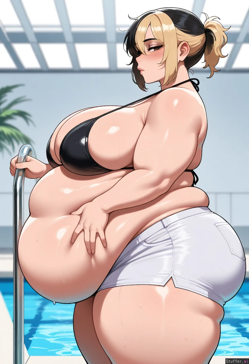 solo, masterpiece, amazing resolution, nyantcha(artist), krekkov(artist), dramatic lighting, standing up, skindentation,(small ponytail), tall,(black bikini),((white shorts)), large breasts, looking at viewer, half closed eyes, tired, blushing,(detailed obese body:1.7),((side view)), deep navel, wide hips, big ass, (obese, big belly, weight gain fetish),1woman,(black and blonde hair),(dyed black and blonde color),((black dyed hair)),(mostly black color on hair),dark brown eyes,((black hair)),(short ponytail),pool on background,