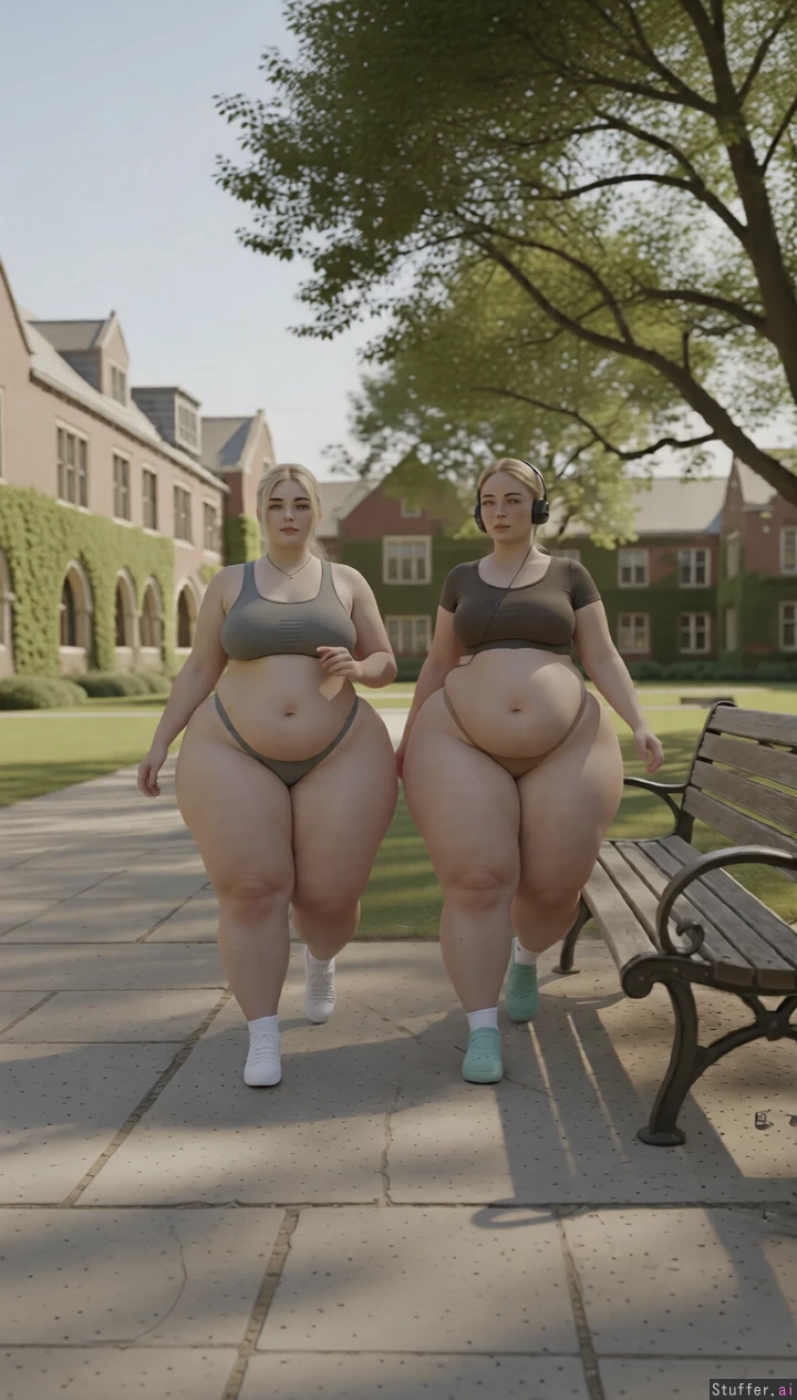 High quality, masterpiece, realistic lighting, high detail, really pretty faces, extremely fatter and fatter, they jiggle a bit, they swiftly walks by, keep her entire body in frame, extreme saddlebag hips, full body view, camera pulls away, wide angle, huge belly