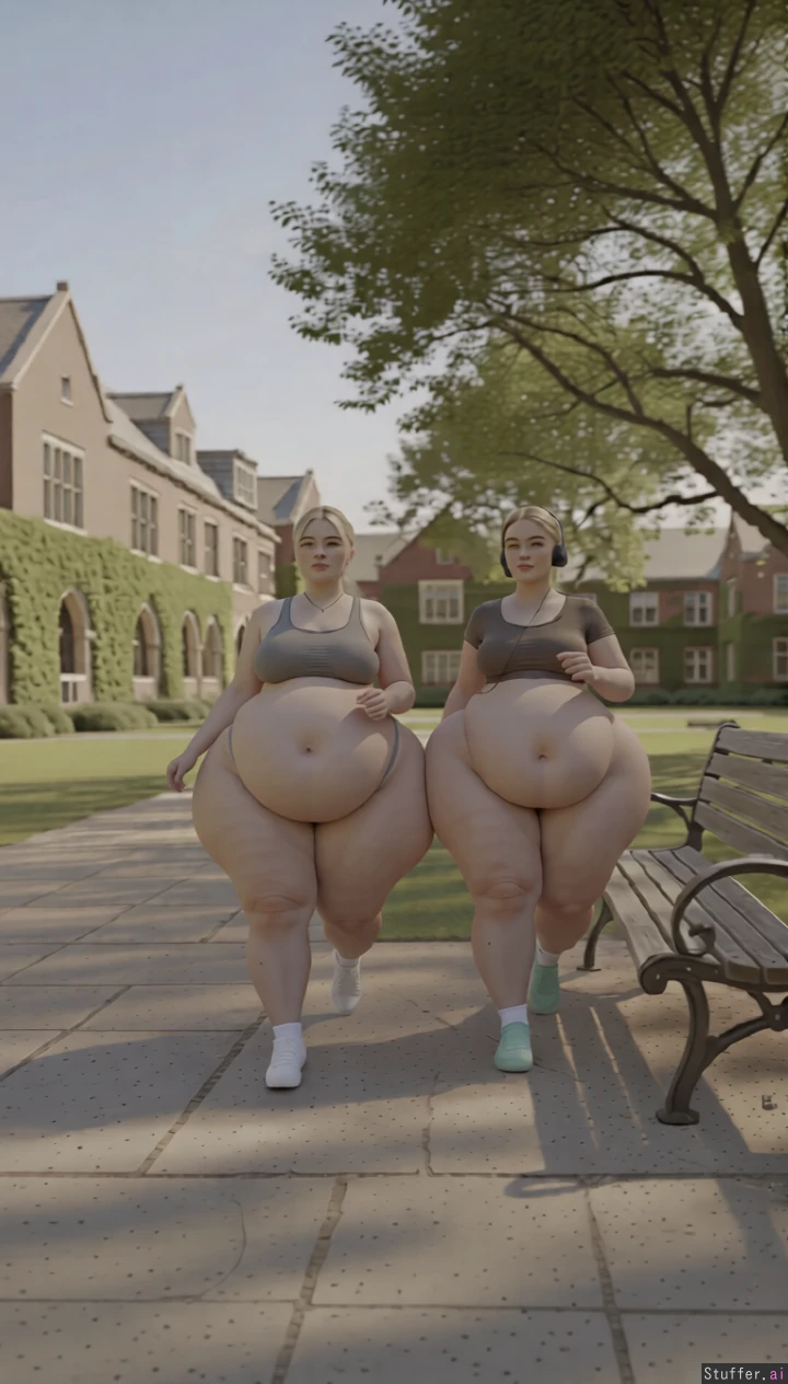 High quality, masterpiece, realistic lighting, high detail, really pretty faces, extremely fatter and fatter, they jiggle a bit, they swiftly walks by on a campus, keep her entire body in frame, extreme saddlebag hips, full body view, camera pulls away, huge belly getting bigger
