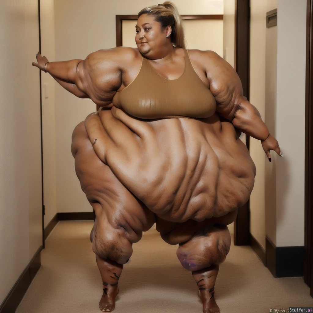 (meryl streep face:1.0) hallway ((wide hips:1.8)) ((fat legs:1.8)) (dark tanned skin:1.5) masterpiece, RAW photo, UHD (3D rendition:1.3) navel:1.4 (blonde bangs ponytail) ((deep navel indentation, bellybutton) ((side view) (((fat arms:2.2)))