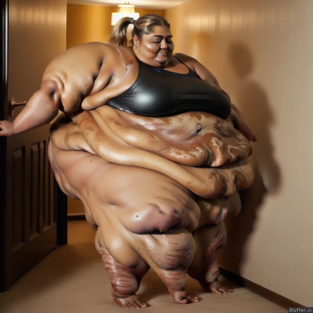 (meryl streep face:1.0) hallway ((wide hips:1.8)) ((fat legs:1.8)) (dark tanned skin:1.5) masterpiece, RAW photo, UHD (3D rendition:1.3) navel:1.4 (blonde bangs ponytail) ((deep navel indentation, bellybutton) ((side view) (((fat arms:2.2))) (((((slumping blob:1.6)))))