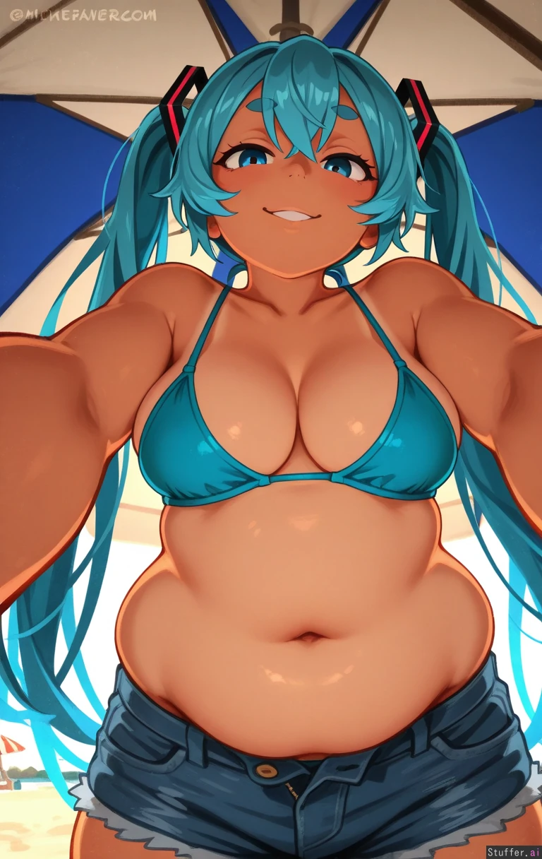 1girl 1brazillian_miku, blue Miku hair, tanned skin ,khyle. /(artist/), Busty girl, Big belly,flabby tummy with rolls low navel, in a room ((excited gaze, sly expression, half closed mischievous eyes, michevious eyebrows )) , (( POV looks you in the eyes )), dominant, pushing belly into your face Pudgy ((belly)) Deep navel 1.2,deeply enlarged navel,medium stomach with rolls,hanging and jiggly belly,sagging belly,deep navel 1.5,flabby tummy ,(skin dentation), ,skinny girl,belly (( sagging belly 1 )) (( pov You're looking at her from below )) ((Soft belly, heavy belly))((Fat rolls ))((belly_jiggly)) Black bikini bra and some very tight unbuttoned denim short (((Setting: outside at the beach under a beach umbrella)))