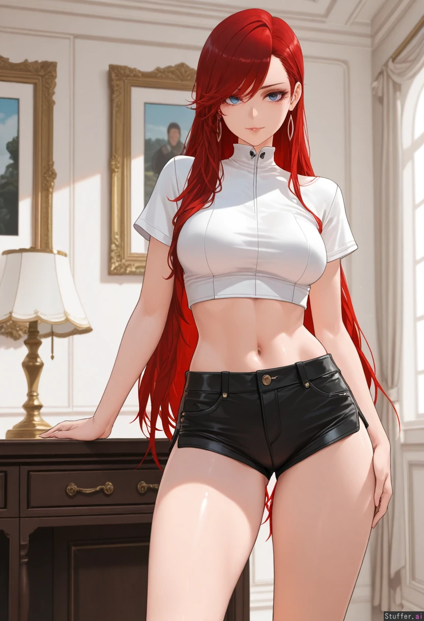 (Dishwasher1910/(artis)), best quality, high rating, (( photorealis, ultra realistic style, ultra realistic face, )), ((long red hair, woman, , side-swept bangs, makeup, eyelashes,)), 25 years old), cottage, (super detailed, good shading), beautiful alluring blue eyes, ((White crop top and black short shorts)) ((Seductive expression)), ((), sultry, playful, horny, ( thick thighs,), (medium soft breasts, ), ( model female , perfect figure)) Inside expensive mansion,), front view, standing