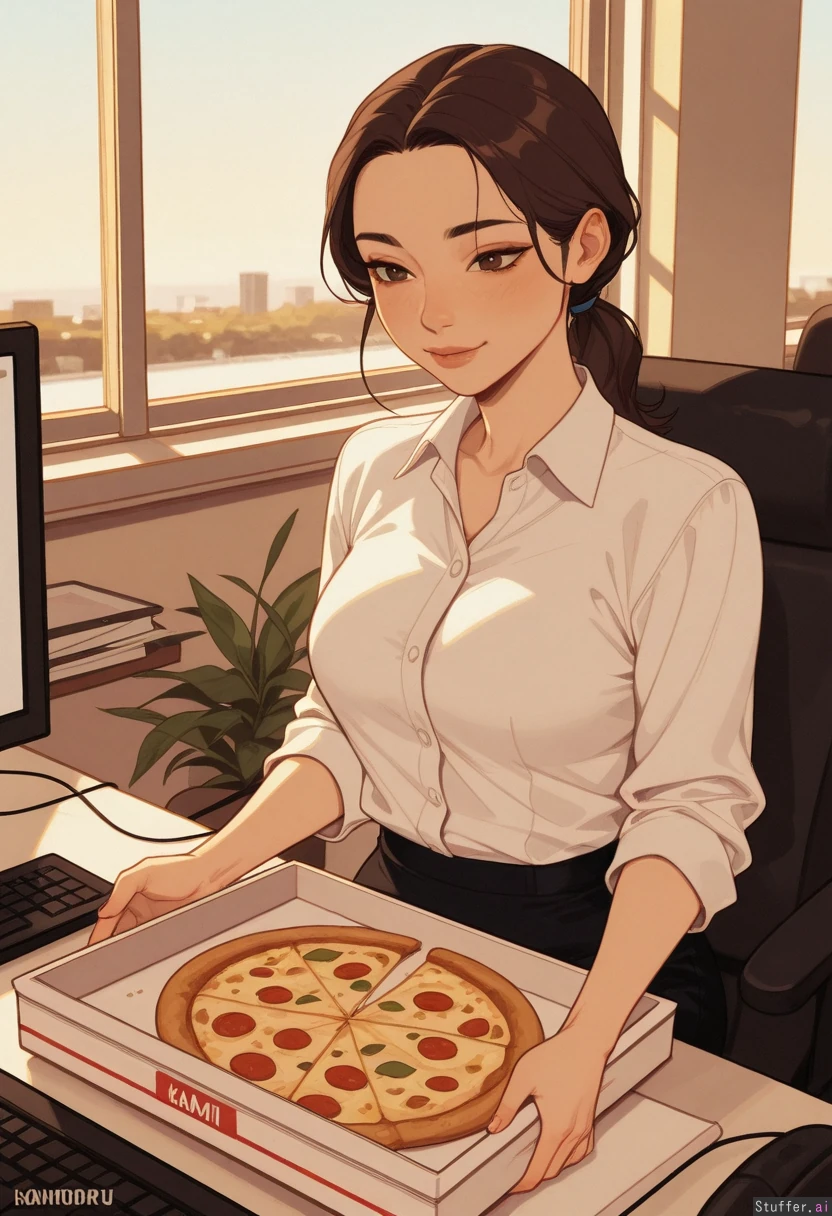 Highly detailed, morning, warm colors, KAMII MOMORU (artist), sitting, office, pc, keyboard, break Japanese girl, asian, medium hair, brown hair, black skirt, white buttoned shirt, tied hair, low ponytail Smile, holding pizza box, looking at the box