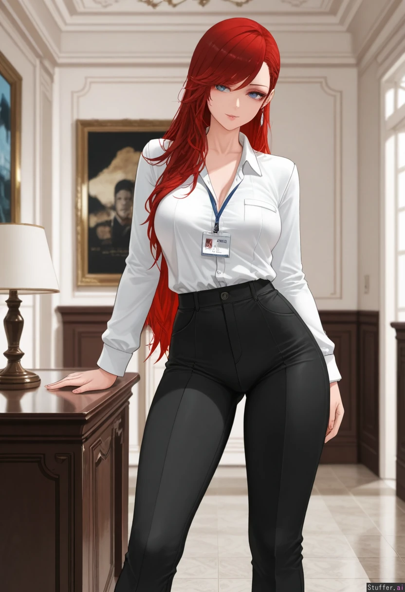 (Dishwasher1910/(artis)), best quality, high rating, (( photorealis, ultra realistic style, ultra realistic face, )), ((long red hair, woman, , side-swept bangs, makeup, eyelashes,)), 25 years old), cottage, (super detailed, good shading), beautiful alluring blue eyes, (( wearing white long sleeve office shirt and black office pants)) ((Seductive expression)), ((), sultry, playful, horny, ( thick thighs,), (medium soft breasts, ), ( model female , perfect figure)) Inside expensive mansion,), front view, standing