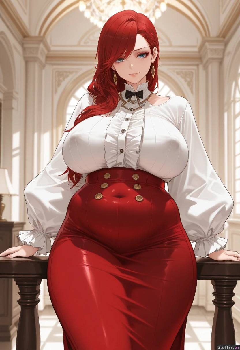 (Dishwasher1910/(artis)), best quality, high rating, (( photorealis , ultra realistic style, ultra realistic face, )), ((long red hair, woman, , side-swept bangs, makeup, eyelashes,)), 25 years old), cottage, (super detailed, good shading), beautiful alluring blue eyes, (bow tie, gold necklace, puffy long sleeves, tucked in, strained buttons, shirt, high waist, straight pencil long belt skirt, ((Seductive expression)), ((), sultry, playful, horny, (Huge thick thighs,), (colossal soft breasts, slight nipple bulge, ), (obese female:1.3) Inside expensive mansion, chubby lower belly), front view, standing