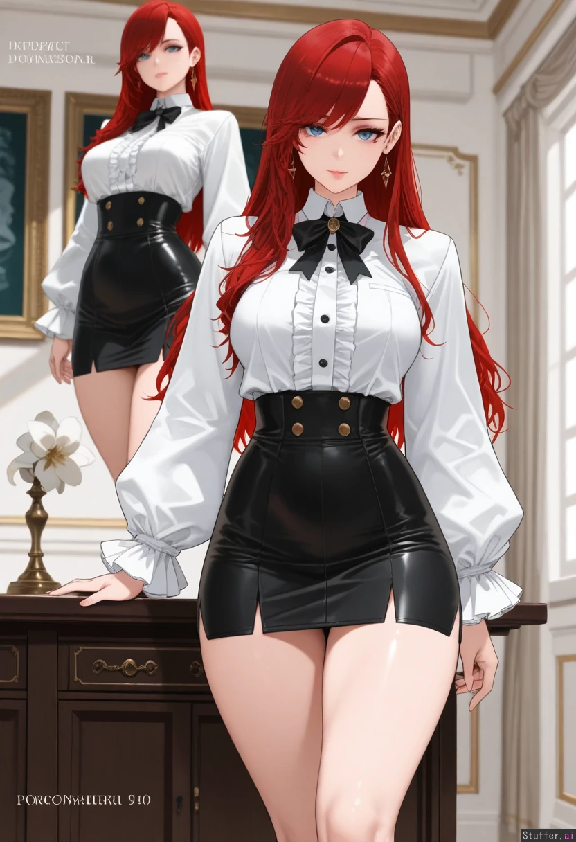 (Dishwasher1910/(artis)), best quality, high rating, (( photorealis, ultra realistic style, ultra realistic face, )), ((long red hair, woman, , side-swept bangs, makeup, eyelashes,)), 25 years old), cottage, (super detailed, good shading), beautiful alluring blue eyes, (bow tie, gold necklace, puffy long sleeves, tucked in, strained buttons, shirt, high waist, straight pencil long belt skirt, ((Seductive expression)), ((), sultry, playful, horny, ( thick thighs,), (medium soft breasts, ), ( model female , perfect figure)) Inside expensive mansion,), front view, standing