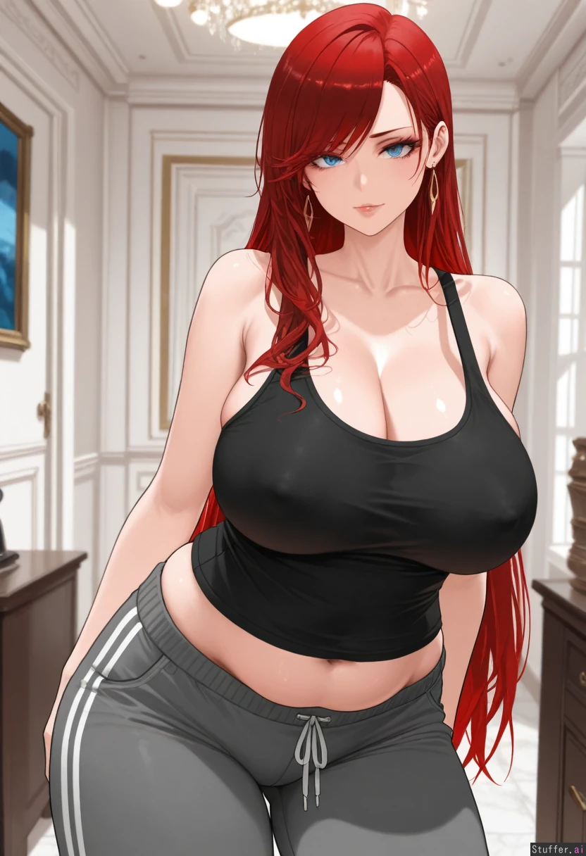 (Dishwasher1910/(artis)), best quality, high rating, (( photorealis , ultra realistic style, ultra realistic face, )), ((long red hair, woman, , side-swept bangs, makeup, eyelashes,)), 25 years old), cottage, (super detailed, good shading), beautiful alluring blue eyes, ((Wearing black tank top and gray sweatpants))) ((Seductive expression)), ((), sultry, playful, horny, (Huge thick thighs,), (colossal soft breasts, slight nipple bulge, ), (obese female:1.3) Inside expensive mansion, chubby lower belly), front view, standing