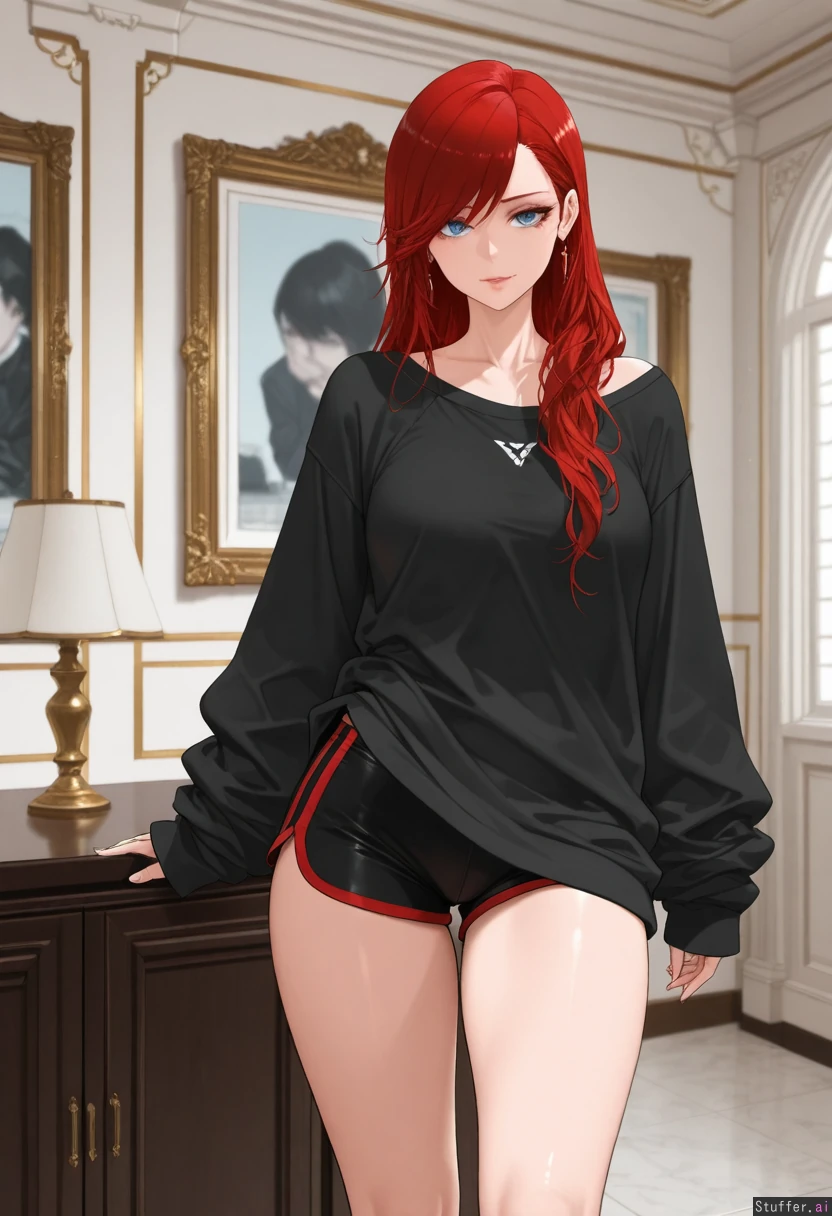 (Dishwasher1910/(artis)), best quality, high rating, (( photorealis, ultra realistic style, ultra realistic face, )), ((long red hair, woman, , side-swept bangs, makeup, eyelashes,)), 25 years old), cottage, (super detailed, good shading), beautiful alluring blue eyes, ((Wearing gray over the shoulder loose long sleeve shirt and black sport shorts))) ((Seductive expression)), ((), sultry, playful, horny, ( thick thighs,), (medium soft breasts, ), ( model female , perfect figure)) Inside expensive mansion,), front view, standing