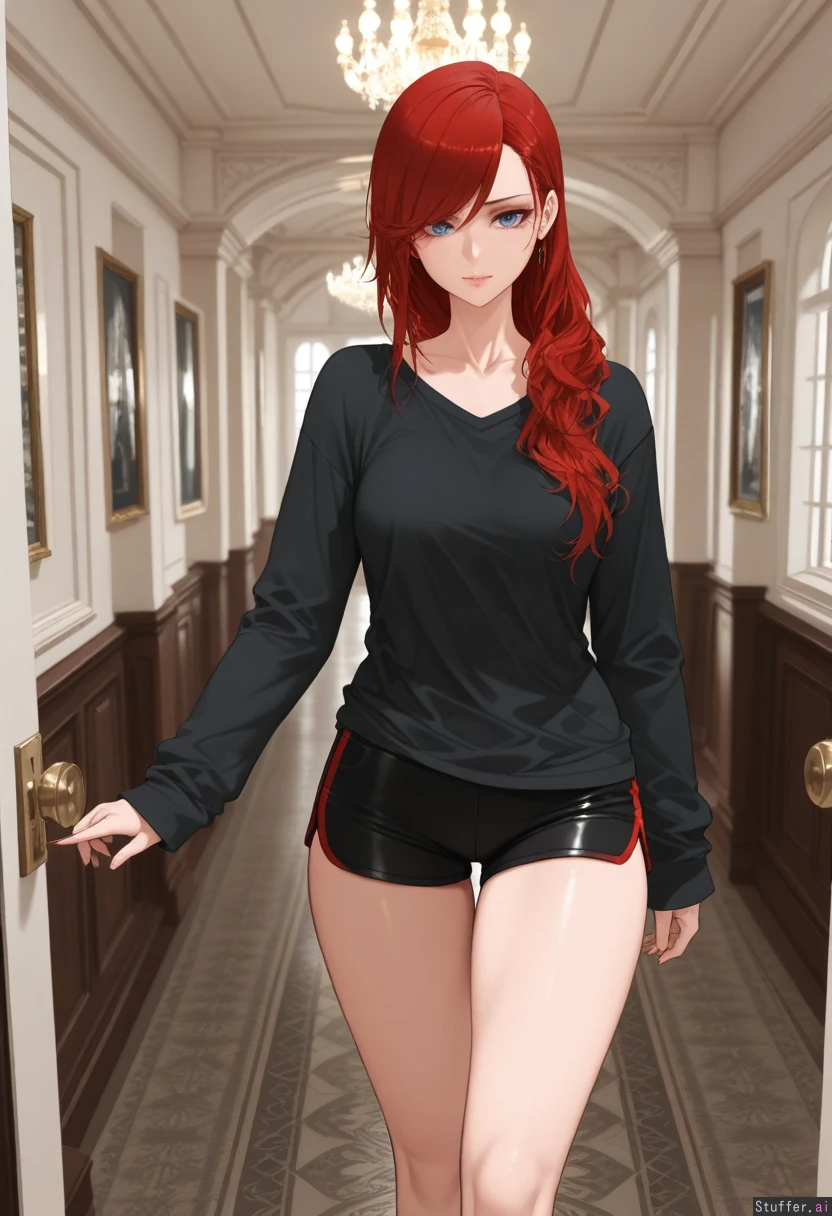 (Dishwasher1910/(artis)), best quality, high rating, (( photorealis, ultra realistic style, ultra realistic face, )), ((long red hair, woman, , side-swept bangs, makeup, eyelashes,)), 25 years old), cottage, (super detailed, good shading), beautiful alluring blue eyes, ((Wearing gray over the shoulder loose long sleeve shirt and black sport shorts))) ((Seductive expression)), ((), sultry, playful, horny, ( thick thighs,), (medium soft breasts, ), ( model female , perfect figure)) Inside expensive mansion,), front view, walking around,