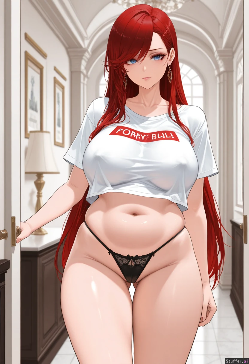 (Dishwasher1910/(artis)), best quality, high rating, (( photorealis , ultra realistic style, ultra realistic face, )), ((long red hair, woman, , side-swept bangs, makeup, eyelashes,)), 25 years old), cottage, (super detailed, good shading), beautiful alluring blue eyes, ((Wearing white loose crop t shirt and black panties))) ((Seductive expression)), ((), sultry, playful, horny, (Huge thick thighs,), (colossal soft breasts, slight nipple bulge, ), (obese female:1.3) Inside expensive mansion, showing chubby lower belly), belly outline, Front view, standing
