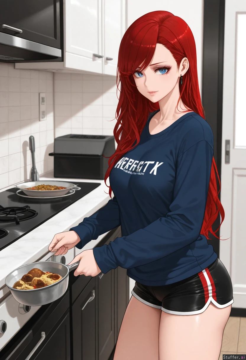 (Dishwasher1910/(artis)), best quality, high rating, (( photorealis, ultra realistic style, ultra realistic face, )), ((long red hair, woman, , side-swept bangs, makeup, eyelashes,)), 25 years old), cottage, (super detailed, good shading), beautiful alluring blue eyes, ((Wearing gray over the shoulder loose long sleeve shirt and black sport shorts))) ((Seductive expression)), ((), sultry, playful, horny, ( thick thighs,), (medium soft breasts, ), ( model female , perfect figure)) Inside expensive mansion,), front view, preparing food in the kitchen,