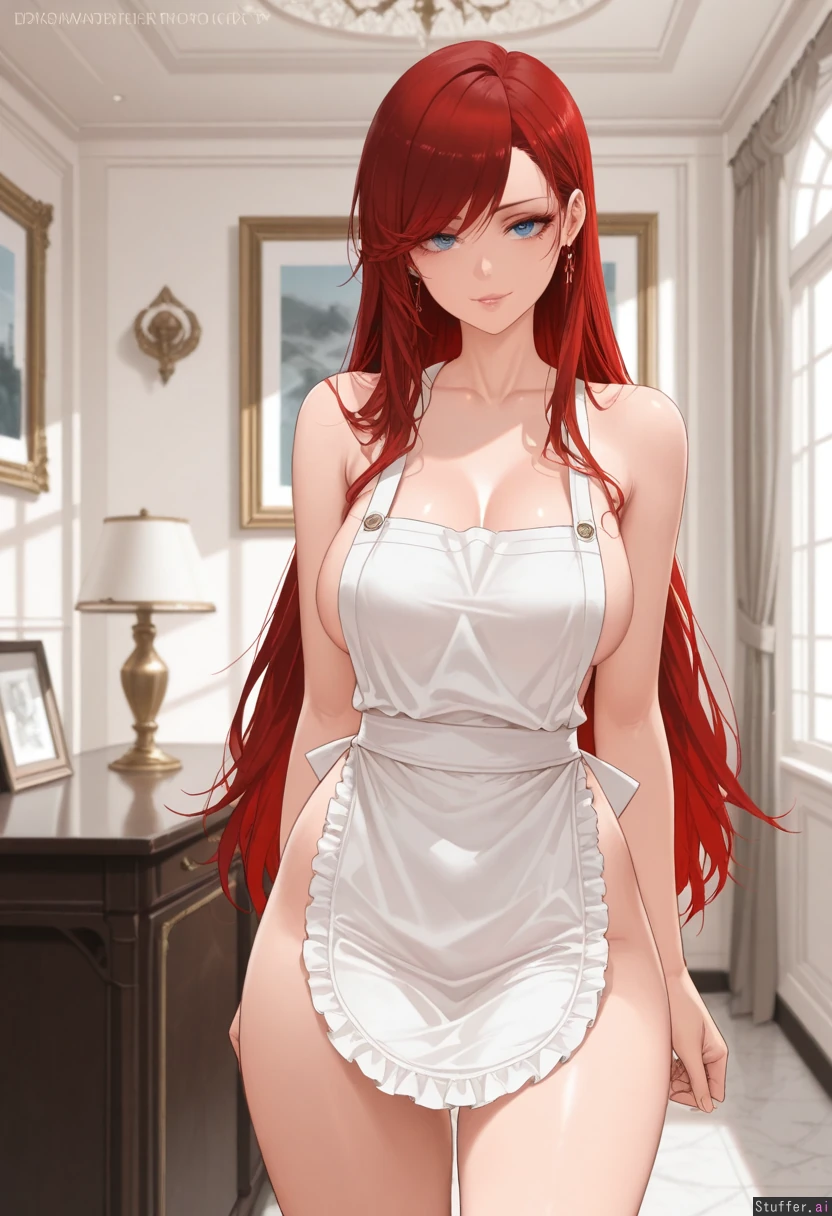 (Dishwasher1910/(artis)), best quality, high rating, (( photorealis, ultra realistic style, ultra realistic face, )), ((long red hair, woman, , side-swept bangs, makeup, eyelashes,)), 25 years old), cottage, (super detailed, good shading), beautiful alluring blue eyes, (( wearing a naked white apron ))) ((Seductive expression)), ((), sultry, playful, horny, ( thick thighs,), (medium soft breasts, ), ( model female , perfect figure)), Inside expensive mansion,), front view, delighted, watching the viewer eat