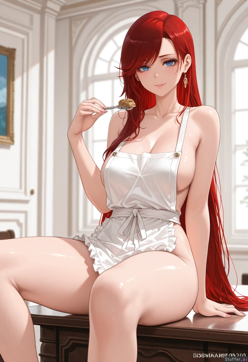 (Dishwasher1910/(artis)), best quality, high rating, (( photorealis, ultra realistic style, ultra realistic face, )), ((long red hair, woman, , side-swept bangs, makeup, eyelashes,)), 25 years old), cottage, (super detailed, good shading), beautiful alluring blue eyes, (( wearing a naked white apron ))) ((Seductive expression)), ((), sultry, playful, horny, ( thick thighs,), (medium soft breasts, ), ( model female , perfect figure)), Inside expensive mansion,), front view, delighted, watching the viewer eat, sitting down on table, first pov