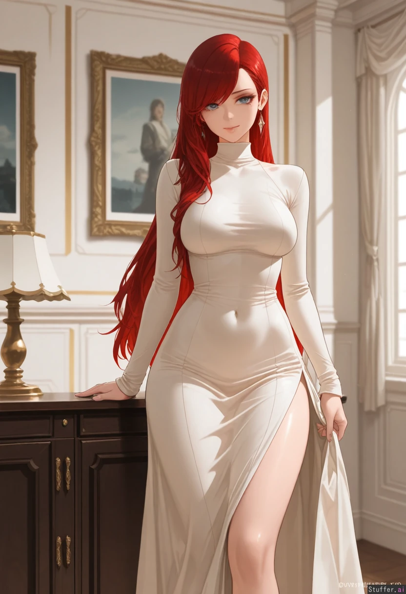 (Dishwasher1910/(artis)), best quality, high rating, (( photorealis, ultra realistic style, ultra realistic face, )), ((long red hair, woman, , side-swept bangs, makeup, eyelashes,)), 25 years old), cottage, (super detailed, good shading), beautiful alluring blue eyes, ((White turtleneck long dress)) ((Seductive expression)), ((), sultry, playful, horny, ( thick thighs,), (medium soft breasts, ), ( model female , perfect figure)) Inside expensive mansion,), front view, standing