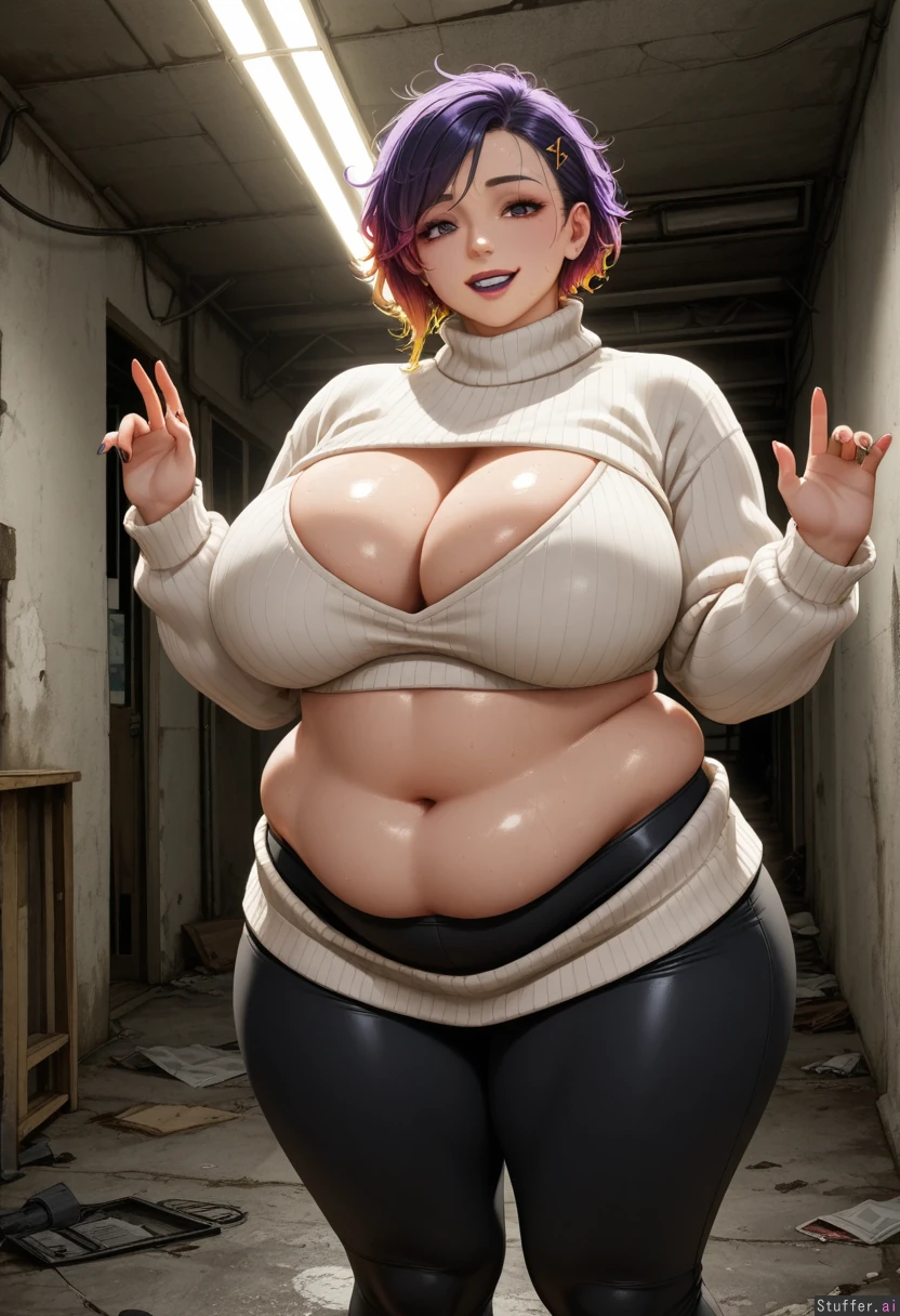 (((Ultra HD), (perfect lighting) photorealistic )) (((Manic_pixie_dream_girl))) Colorful hair, extremely messy hair Colorful nails Lipstick Cleavage . White ribbed sweater, black leggings (Obese female) Extremely Sweaty Perfect figure ((crazy)) , belly, Abandoned warehouse