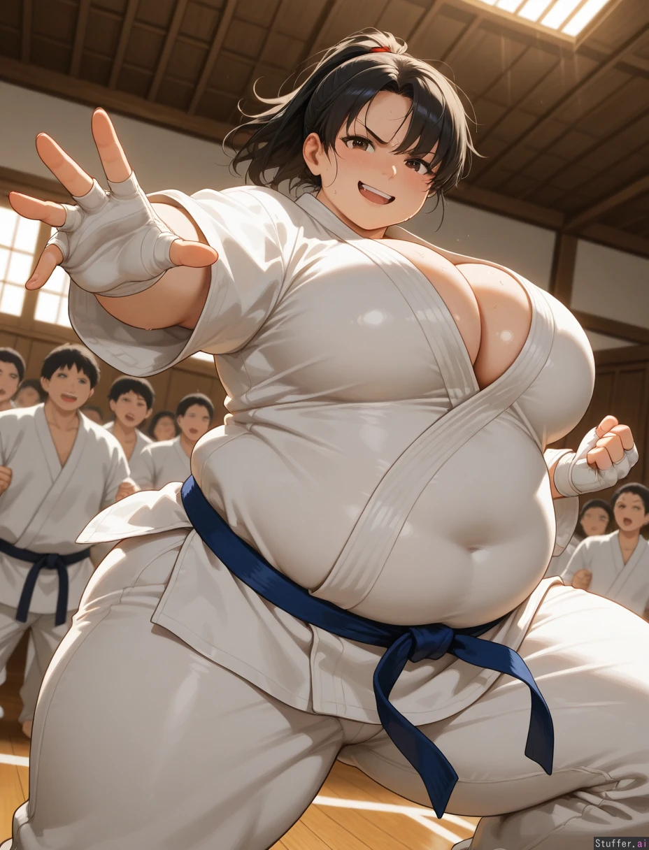 ((Ultra high quality)), ((high quality lighting and shadows)), Martial arts dojo setting, sun rays, window, mountains visible outside window, matted floor, punching bags, karate class context, beautiful tall thick adult female karate woman, confident smirk, ((messy black hair over forehead in a ponytail)), ((detailed beautiful adult strong sexy plump face with large brown eyes)), plump cheeks, thick build, 185lbs, toned thick arms, big round full bursting breasts, (huge round chubby covered belly:1.3), toned thick thighs, white karate_gi, white karate trousers, cleavage, ((blue karate belt)), bandaged hands, wooden boards, hands reaching, good posture, (((karate female crowd in background training))), wide stance, throwing a punch, mouth open, talking to viewer, karate gloves, blush, sweating, shiny skin, angry laughing, ((dynamic jumping in the air)), upper_body, arches back, from an angle, throwing a kick, nipple_outline, pregfat