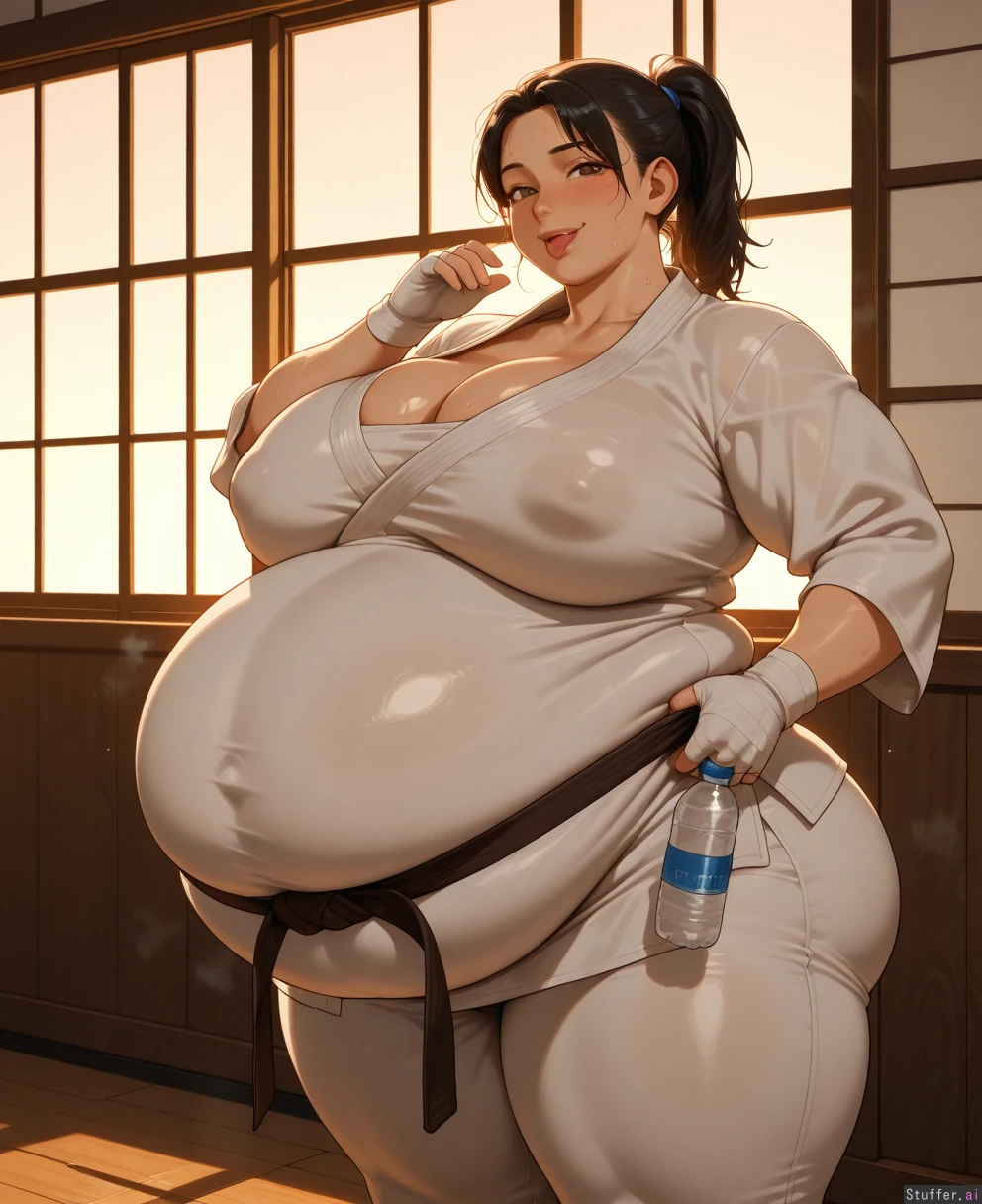 ((Ultra high quality)), ((high quality lighting and shadows)), semi realistic style, Martial arts dojo setting, evening sunset, window, mountains visible outside window, matted floor, karate class context, beautiful tall thick chubby adult female karate woman, confident smirk, ((messy black hair in a ponytail)), ((detailed beautiful adult strong sexy plump face with large brown eyes and full lips)), plump cheeks, thick strong build, 205lbs, ((strong thick arms)), big round full bursting breasts, (huge round chubby taut pregfat belly:1.5), strong thick thighs, white karate_gi, white karate trousers, cleavage, ((brown karate belt)), bandaged hands, wooden boards, leaning back, mouth open, breathing heavily, karate gloves, blush, sweating, shiny skin, round fat ass, ((nipple_outline)), pregfat, ((spherical_inflation:1.4)), ((head thrown back)), ((looking_down)), belly_bursting_out_of_clothes, ((drinking water from bottle)), hand with bottle to mouth, wet_body, wet_clothes, wet_hair, ((tongue out)), ((confident smile)), one hand on belt, leaning against window, plump chin, steaming_body, (chubby cheeks)