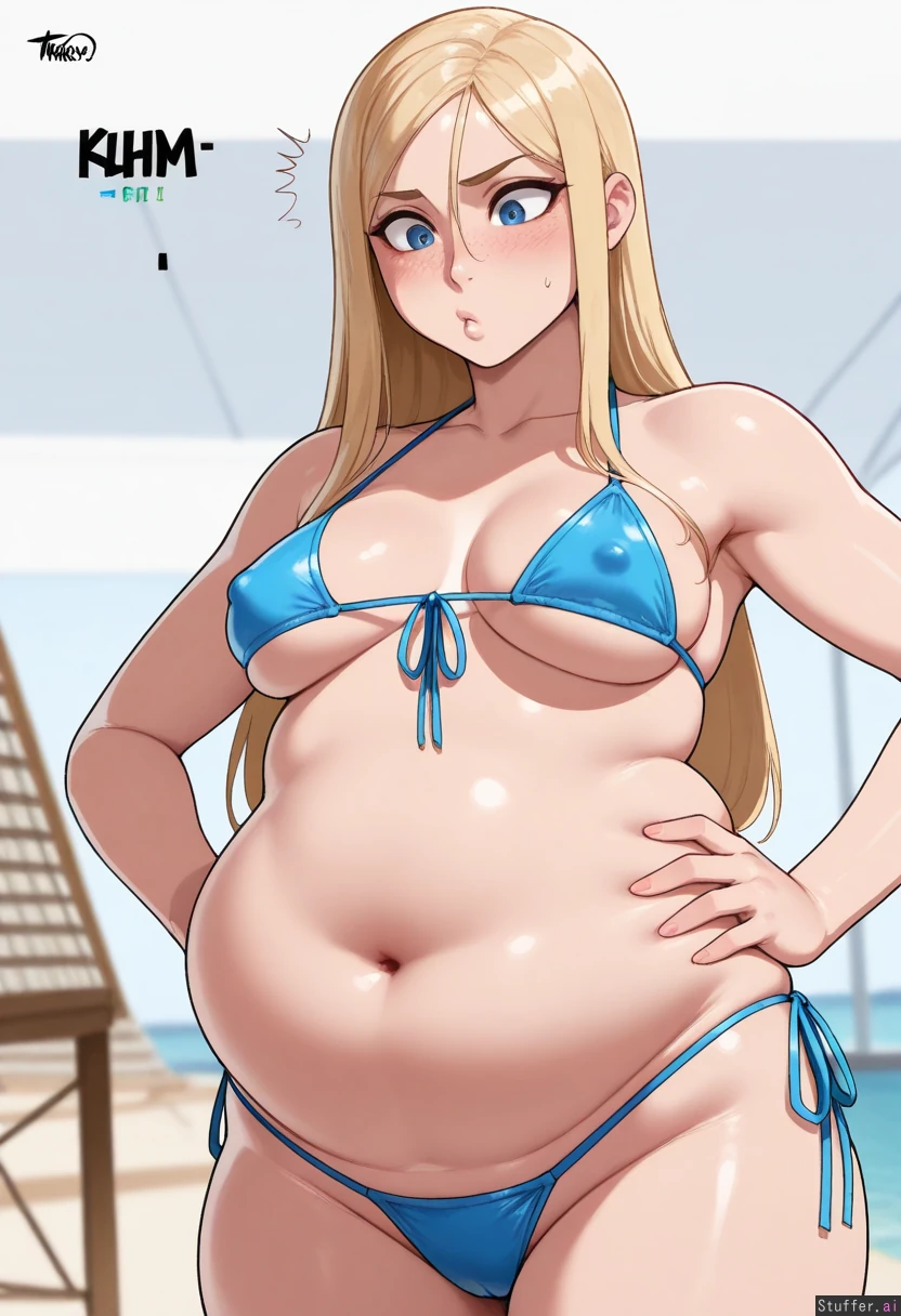 (nyantcha:1.2), (krekkov:1.3), (reiq:1.1), (kittew:1.2), 8k, high resolution, maximum pixel density, masterpiece, (((highly detailed))), ((flawless)), (((high rating))), ((highly detailed face)), full resolution, 8k, high resolution, best quality, detailed eyes, ((solo)) Appearance: Long straight blonde hair, blue eyes, tan skin, freckles, blushing heavily, anime-woman, shocked expression, pouting, tall, erect nipples, wide hips, Outfit: blue bikini Location: posing on beach, semi side-view, looking down at self, hands on hips Modifiers: (Slim body:1.9), (large breasts:0.85), (extremely overweight ssbbw:1.0), (chubby:2.0), (large overhanging fat belly:1.50), (fat butt:1.0)