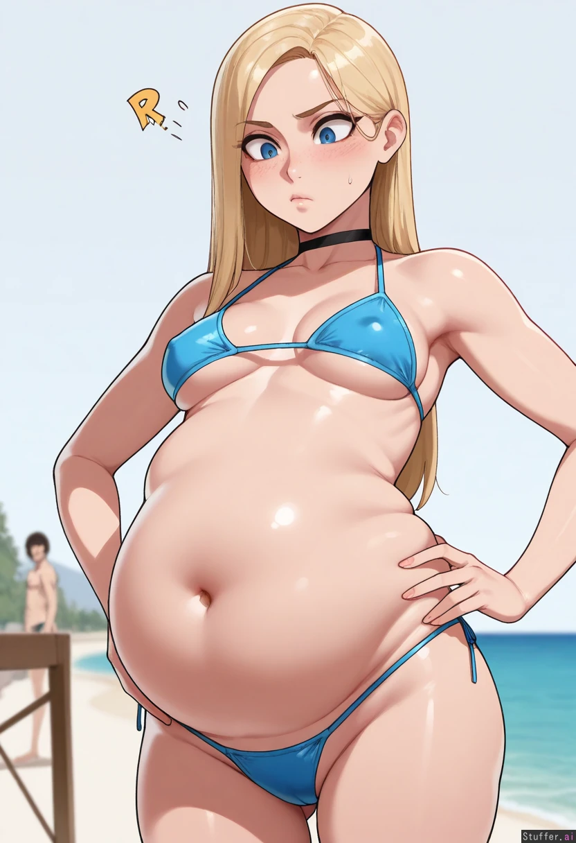 (nyantcha:1.2), (krekkov:1.3), (reiq:1.1), (kittew:1.2), 8k, high resolution, maximum pixel density, masterpiece, (((highly detailed))), ((flawless)), (((high rating))), ((highly detailed face)), full resolution, 8k, high resolution, best quality, detailed eyes, ((solo)) Appearance: Long straight blonde hair, blue eyes, tan skin, freckles, blushing heavily, anime-woman, shocked expression, pouting, tall, erect nipples, wide hips, Outfit: blue bikini Location: posing on beach, semi side-view, looking down at self, hands on hips Modifiers: (Slim body:1.9), (large breasts:0.85), (extremely overweight ssbbw:1.0), (chubby:1.50), (large overhanging fat belly:1.50), (fat butt:1.0)