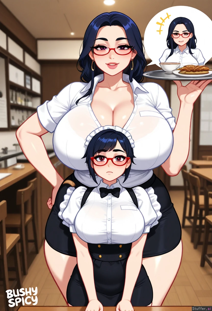 dark_blue_hair, blushyspicy (artist) , waitress, collared_shirt, white_shirt, tight_skirt, medium_skirt, black_skirt, mommy, milf, tier_hair, red_glasses, pink_eyes)) (( Gigantic_breasts:0.9)) ((((fat_female:1.4))))