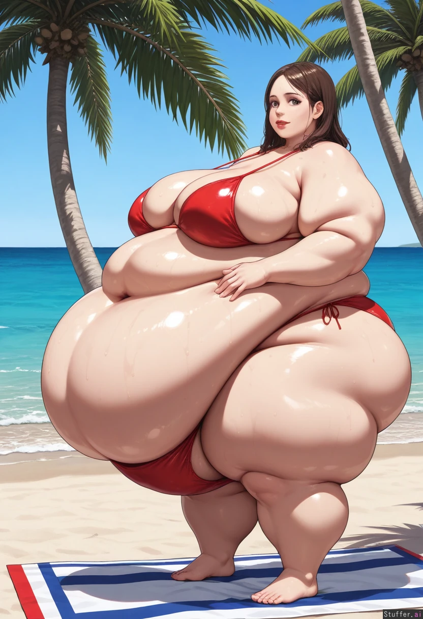 (best quality), (high rating), high res, detailed, ultra quality, ((high quality)), masterpiece, (ultra high resolution), resolution, 8k, uhd, highly detailed illustration, high rating, high contrast, fullHD, ((realistic, detailed face, detailed eyes, photo realistic, retro)) ((very tall legs)) (((On beach, Side view)), ((Relaxing at beach tropical on blanket in Shadow under Palm tree)), (((Standing up))) solo, ssbbw, ((Long Brown Hair)) ((no bangs,straight wavy, wet hair)), (saggy natural breasts), ((Red small Bikini)), ((Massive Belly hang)), (((fat thighs, big thighs))), (((thick thighs))), ((gigantic heavy bloated low hanging bulging swollen enormous flabby sagging belly)), ((((fat arms)))), ((((extremely massively morbidly hyper obese)))),((((fat legs)))), bloated belly. (((Extreme cute, beautiful model face, full Red lips)))