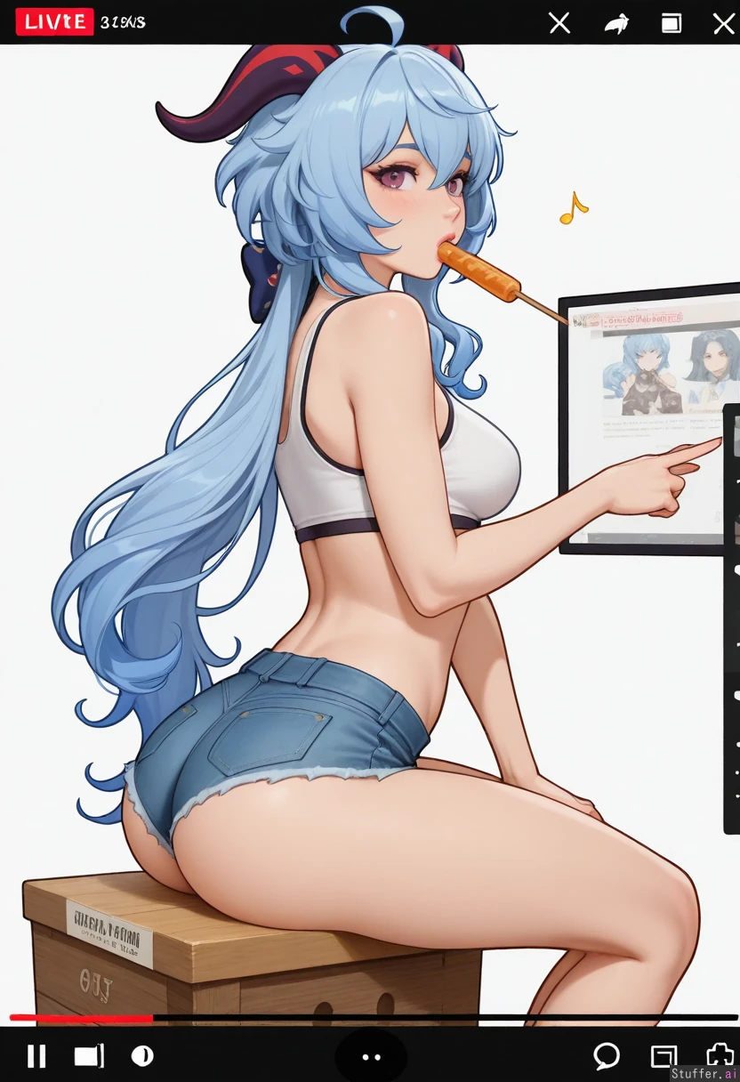 ((flat colors):1.1), ((simple-shading):0.4), ((cutline-outline):1.2), simple background, (pewbutt(artist):1.5), (kittew(artist):0.8), (reiq(artist):0.6), (midnitemorty(artist):0.6), ganyu(genshin_impact), food, empty white background, denim_shorts, open_fly, sports_bra, white_crop_top, sitting, 1girl, livestream, number, exposed_belly, (Skinny, small belly: 0.9), (Chubby, undersized clothes, thick body: 0.1)