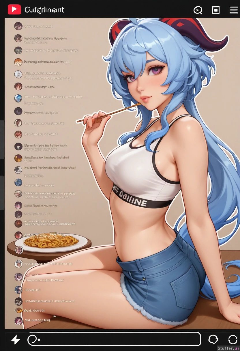 ((flat colors):1.1), ((simple-shading):0.4), ((cutline-outline):1.2), simple background, (pewbutt(artist):1.5), (kittew(artist):0.8), (reiq(artist):0.6), (midnitemorty(artist):0.6), ganyu(genshin_impact), food, denim_shorts, open_fly, sports_bra, white_crop_top, sitting, 1girl, livestream, number, exposed_belly, side view, looking at viewer (Skinny, small belly: 0.9), (Chubby, undersized clothes, thick body: 0.1)