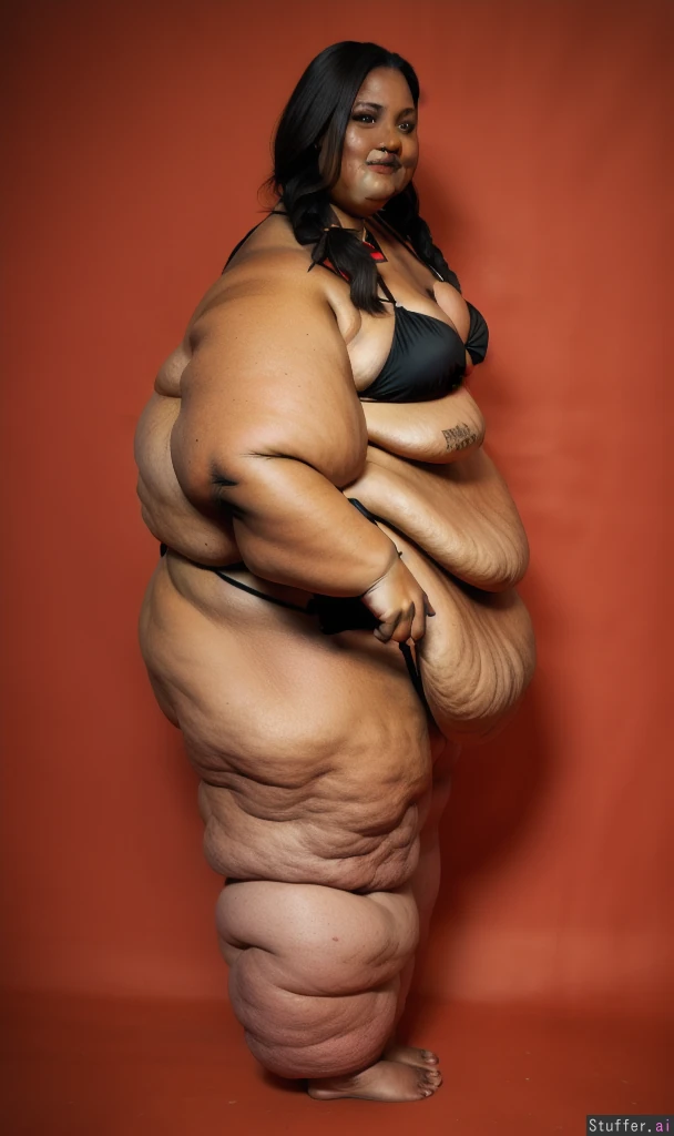 Photo realistic, highly detailed, realistic lighting, african ssbbw, standing, beautiful face:1.4, (ultra double chin:1.8), (ultra fat face:1.8), black braided hair:1.4, (wearing a black bikini:1.4), ultra huge arms:1.9), (ultra huge legs:1.9), (ultra leg rolls:1.7), (ultra huge calves:1.8), (small breasts:1.4), (cellulite:1.5), ultra fat ankles:1.8), bare feet:1.4, (small breasts:1.4)