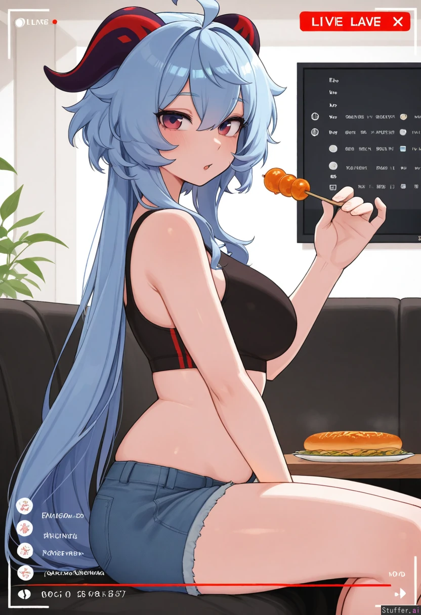 RockSolidArt. /(artist/), RockSolidArt(artist/) ,8), (merunyaa), (usa37107692:1.2), (ohasi_art), (betterwithsalt) ganyu(genshin_impact), food, denim_shorts, open_fly, sports_bra, white_crop_top, sitting, 1girl, livestream, number, exposed_belly, side view, looking at viewer (Skinny, small belly: 0.9), (Chubby, undersized clothes, thick body, embarrased: 0.1)