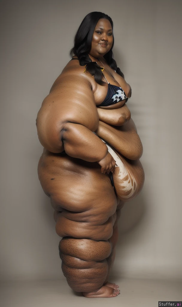 Photo realistic, highly detailed, realistic lighting, african ssbbw, standing, beautiful face:1.4, (ultra double chin:1.8), (ultra fat face:1.8), black braided hair:1.4, (wearing a black bikini:1.4), (ultra huge arms:1.9), (ultra huge legs:1.9), (ultra leg rolls:1.7), (ultra huge calves:1.8), (small breasts:1.4), (cellulite:1.5), ultra fat ankles:1.8), bare feet:1.4, (small breasts:1.4)