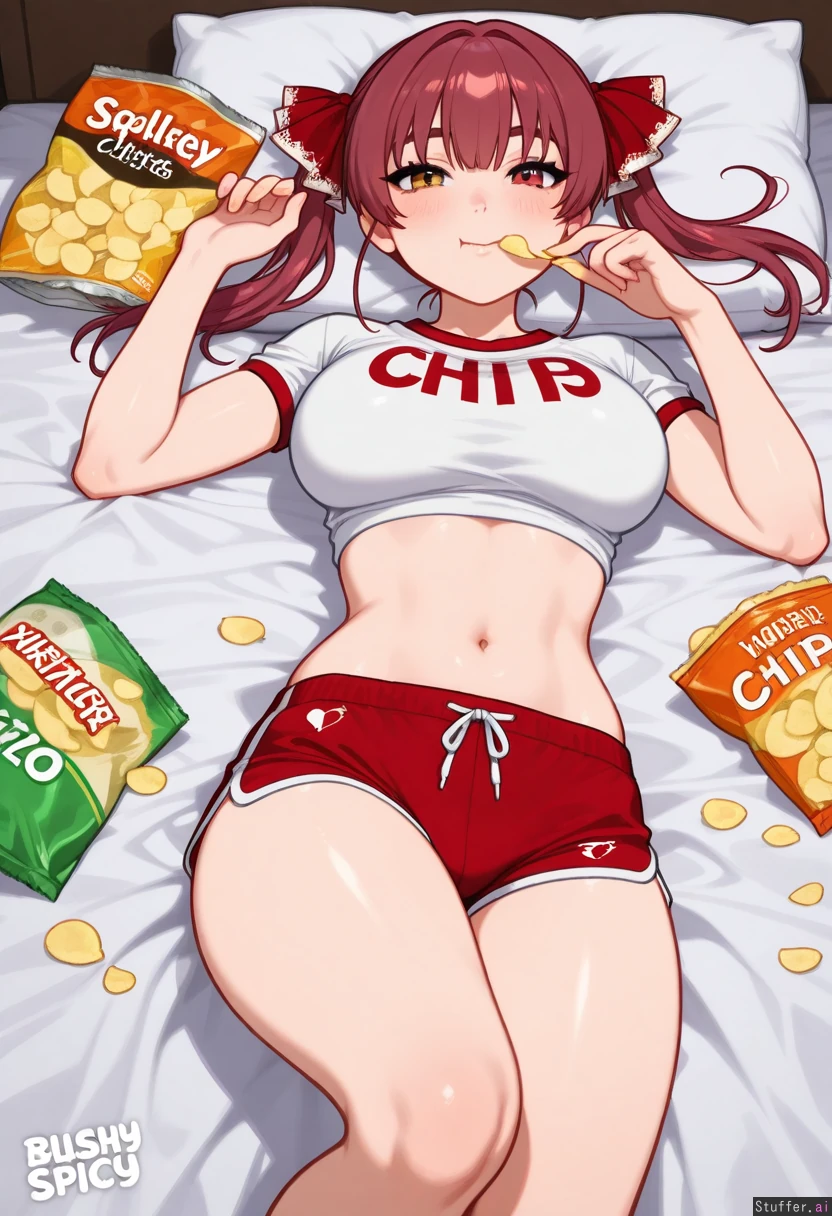 1girl, c.cu(artist), Softservice(artist), blushyspicy(artist), spellsx(artist), houshou_marine, red_hair, casual_clothes, volleyball_shorts, crop_top, white_shirt, laying_on_bed, looking_at_viewer, (bored:1.0), (eating_chips:1.5), (skinny, slim_waist:0.6), (chubby_thighs, chubby_belly, chubby_arms, lovehandles, flabby_belly, plump:0.3)